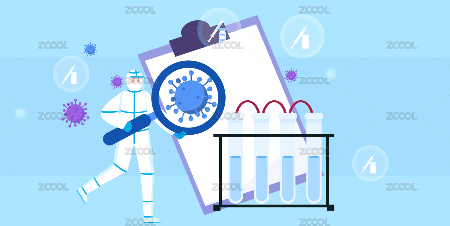 卡通手绘医疗研究院用显微镜研究病毒插画