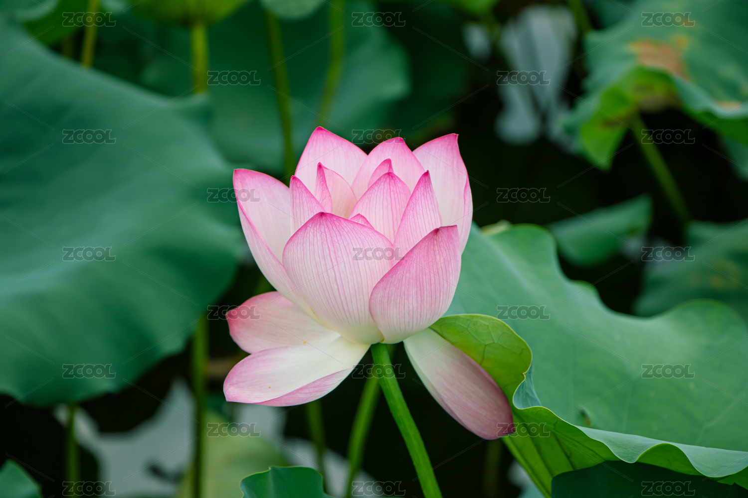 粉红色莲花在绿色荷叶间绽放