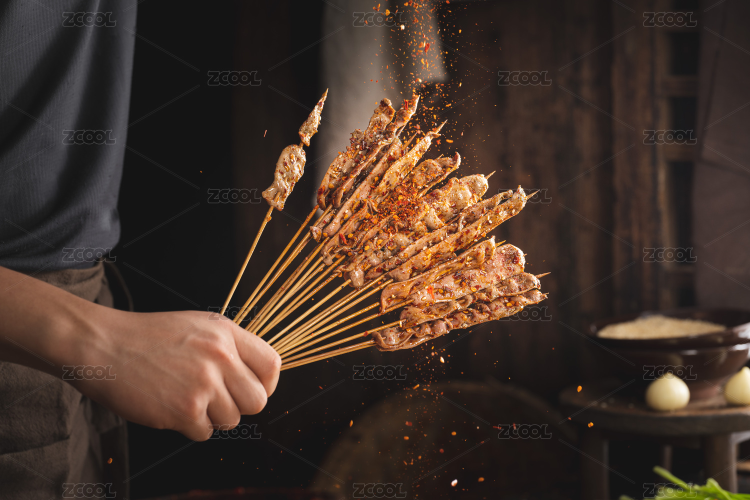 暗背景砧板水上多串放一起的烤肉羊肉串