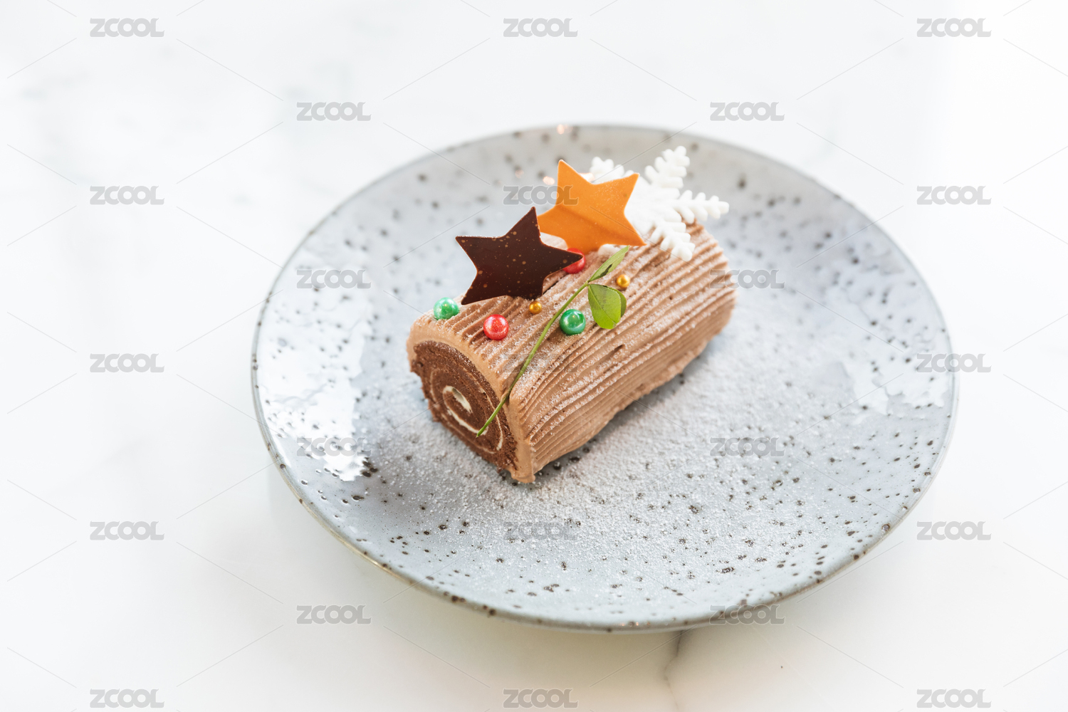 棕色木纹桌面上放着一份圣诞主题的草莓蛋糕