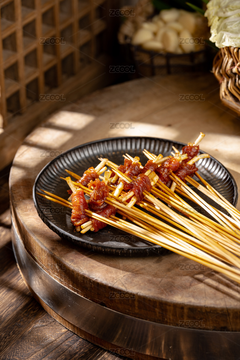 竹签串着炭火烤制的烧烤麻辣烤串五花肉