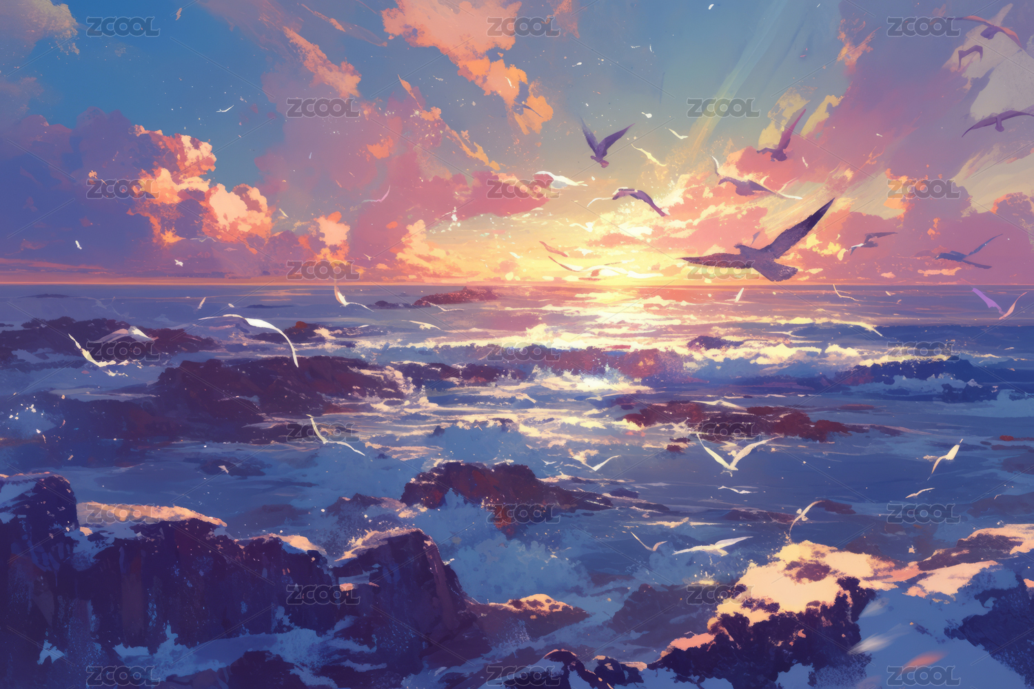 海洋上的飞鸟与落日