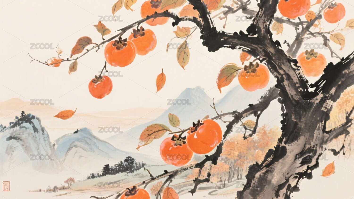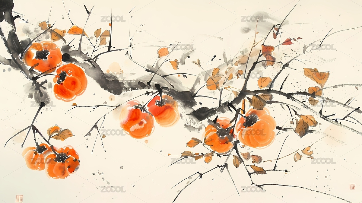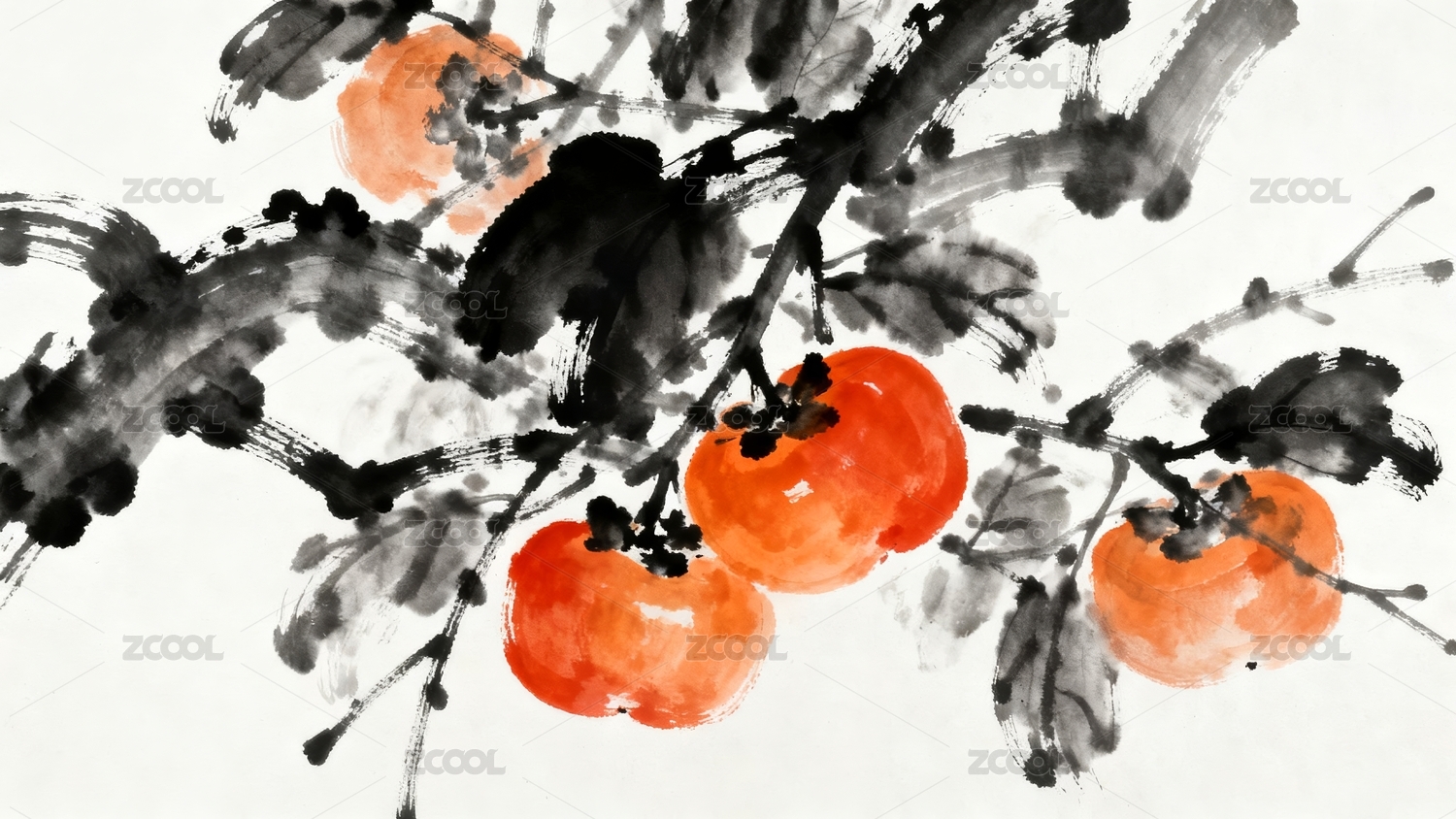 中国,水墨,柿子,树枝,毛笔,笔触,艺术品,柔和,水彩,插画