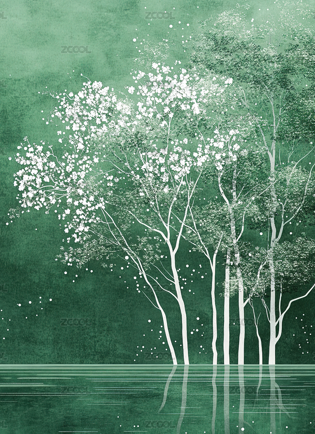 数码水彩湖泊花朵树木风景抽象海报背景
