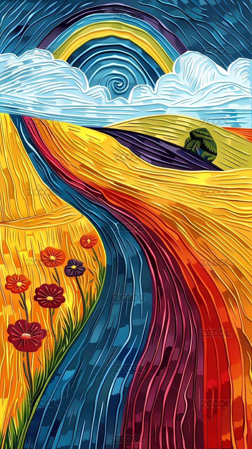 彩虹,人,云,波浪,插画,蓝色,粉红色,橙色,太阳,光线