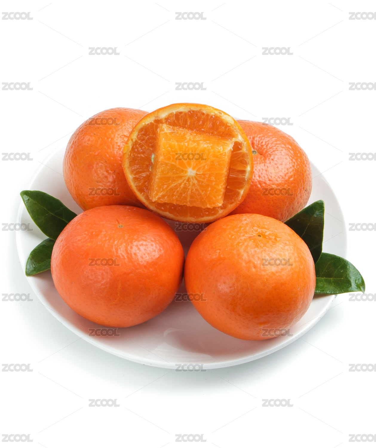 白底上放着一堆新鲜麻阳冰糖橙和切面的橙子