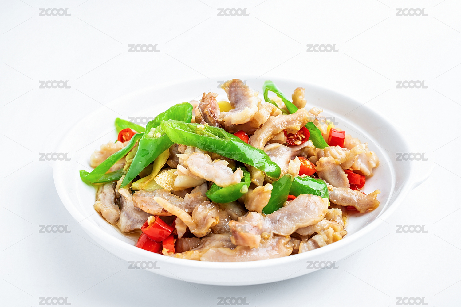 家常菜青椒炒猪油渣盛放在白色瓷器碗中