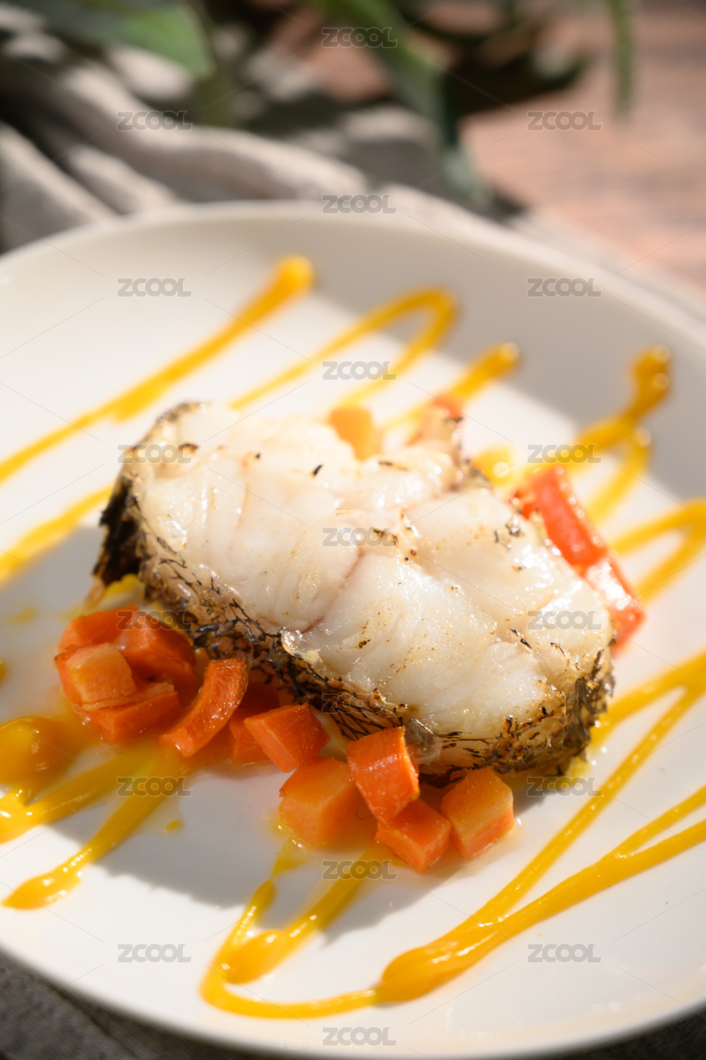 桌面上的盘子里的美味可口的煎鳕鱼扒