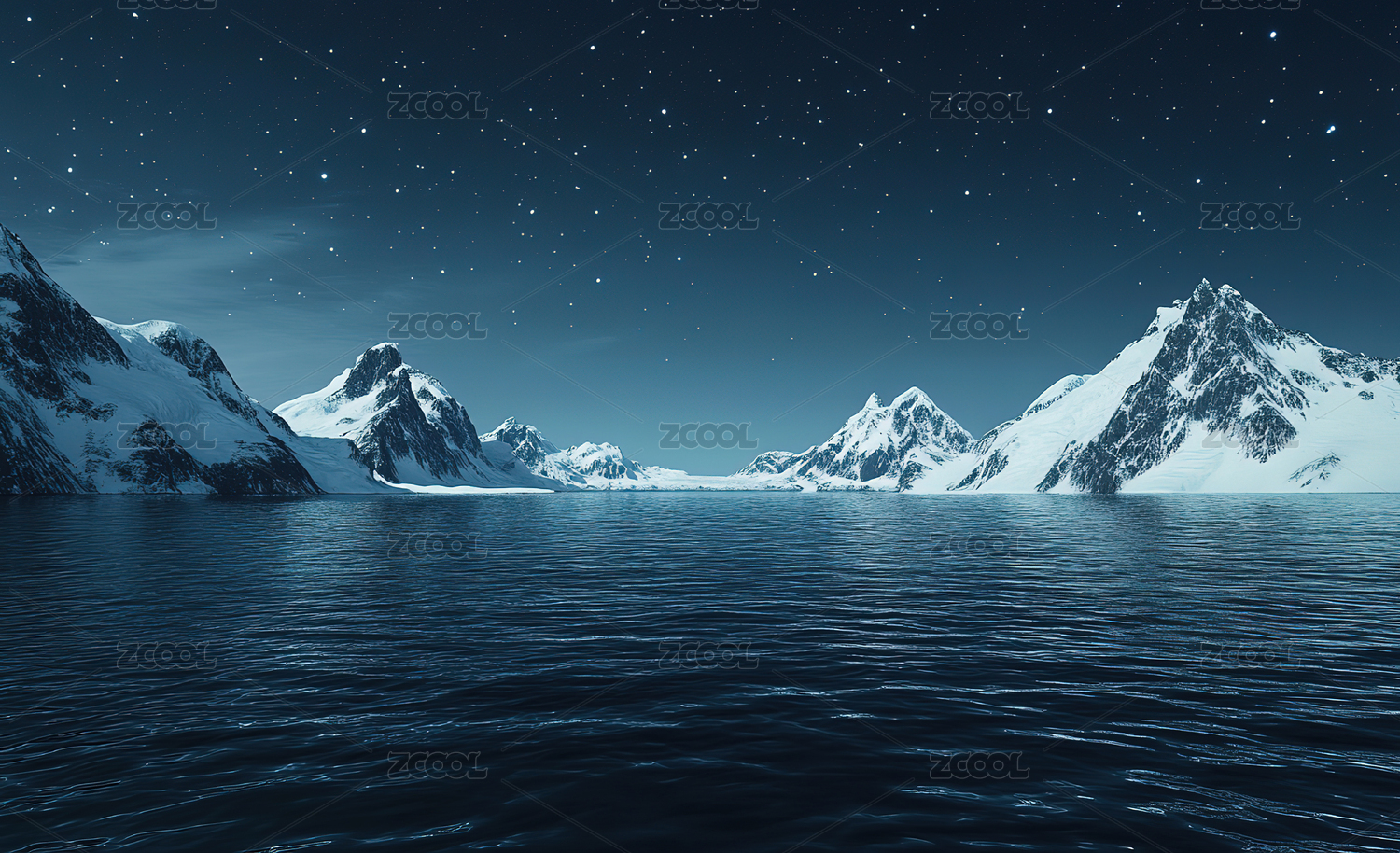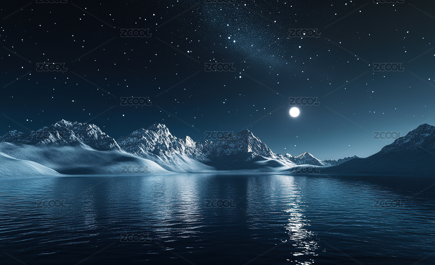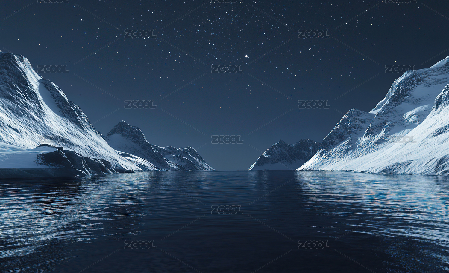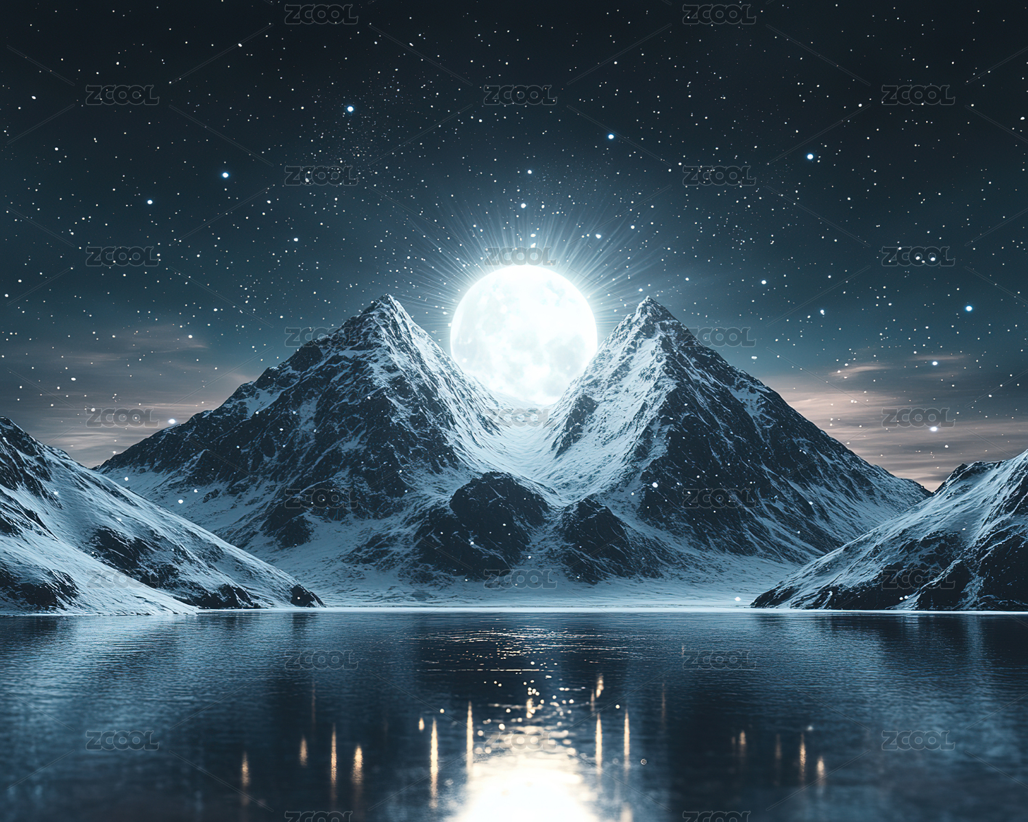 夜幕下白雪皑皑的群山湖景