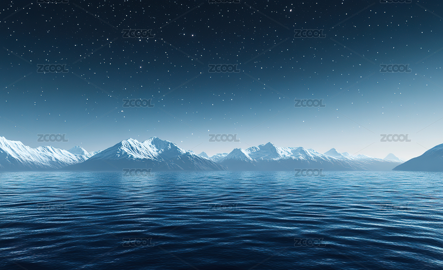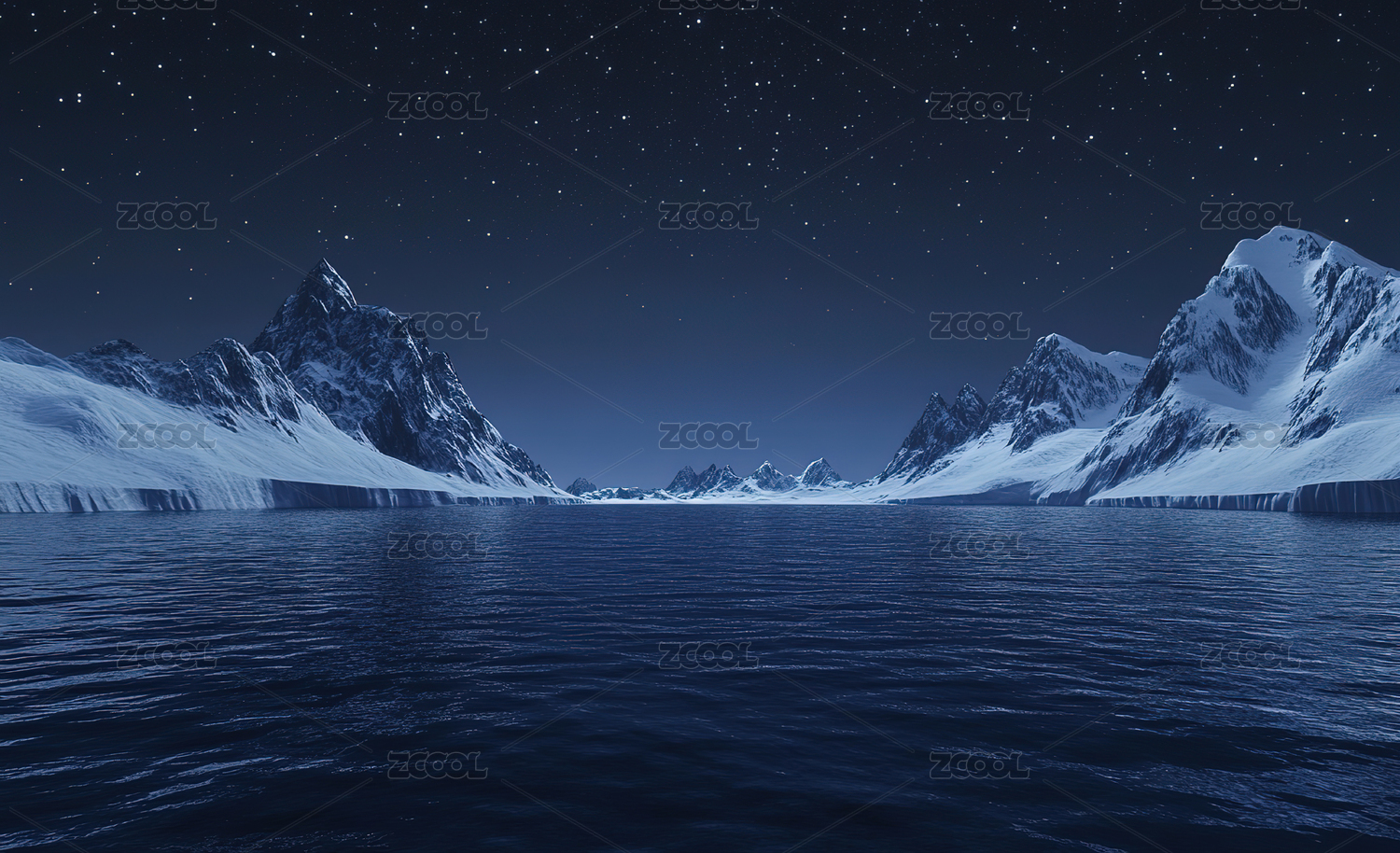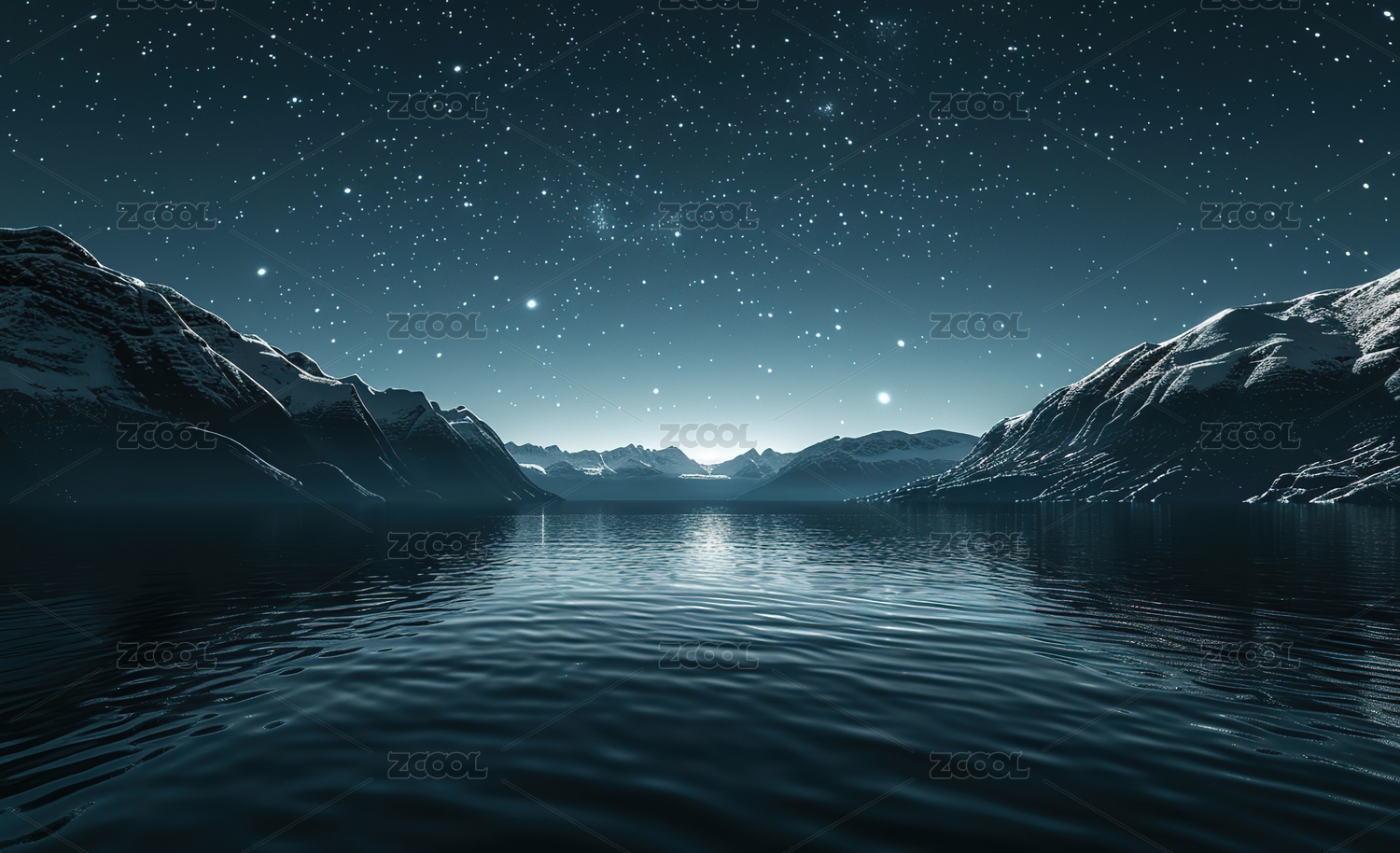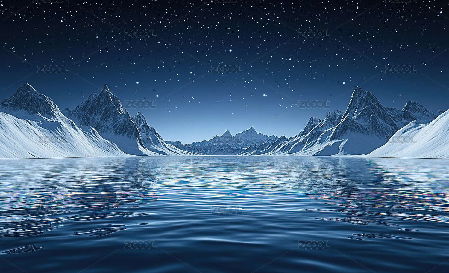 夜幕下白雪皑皑的群山湖景