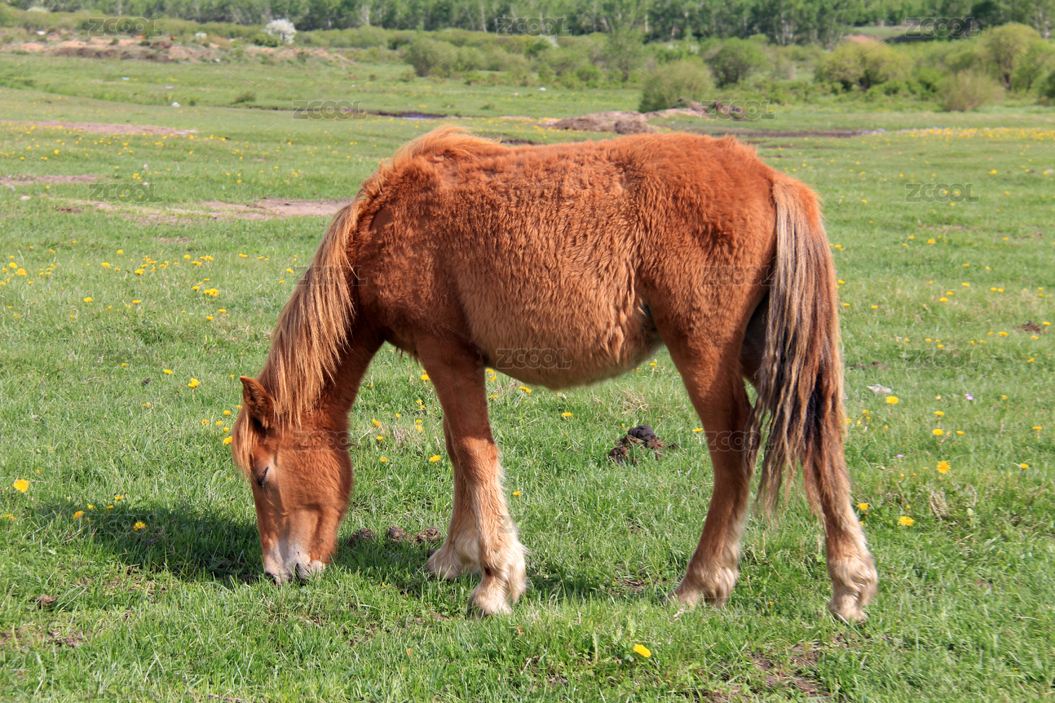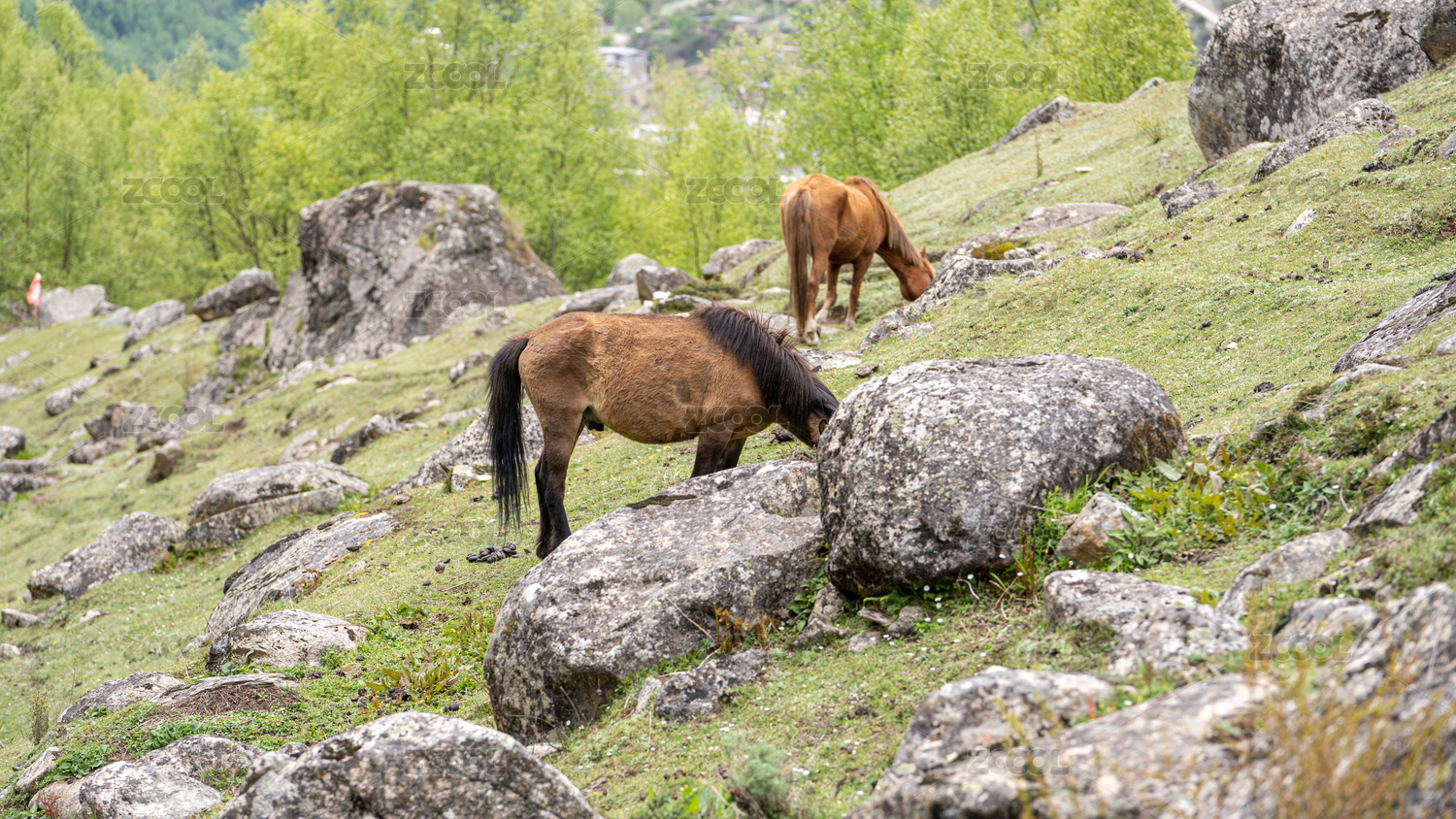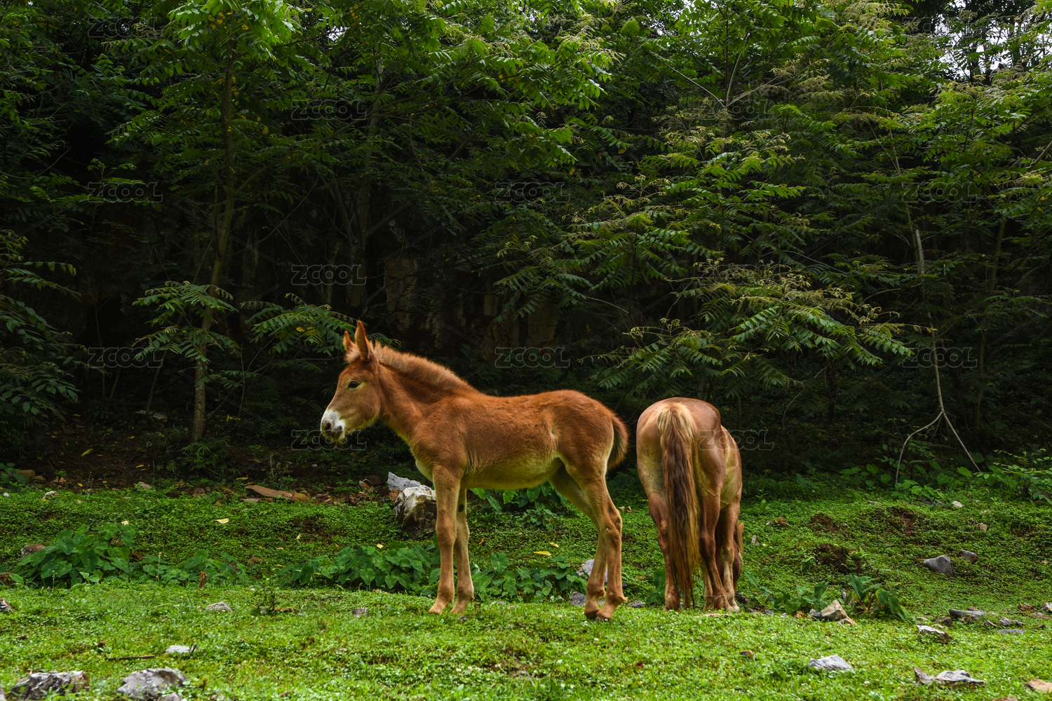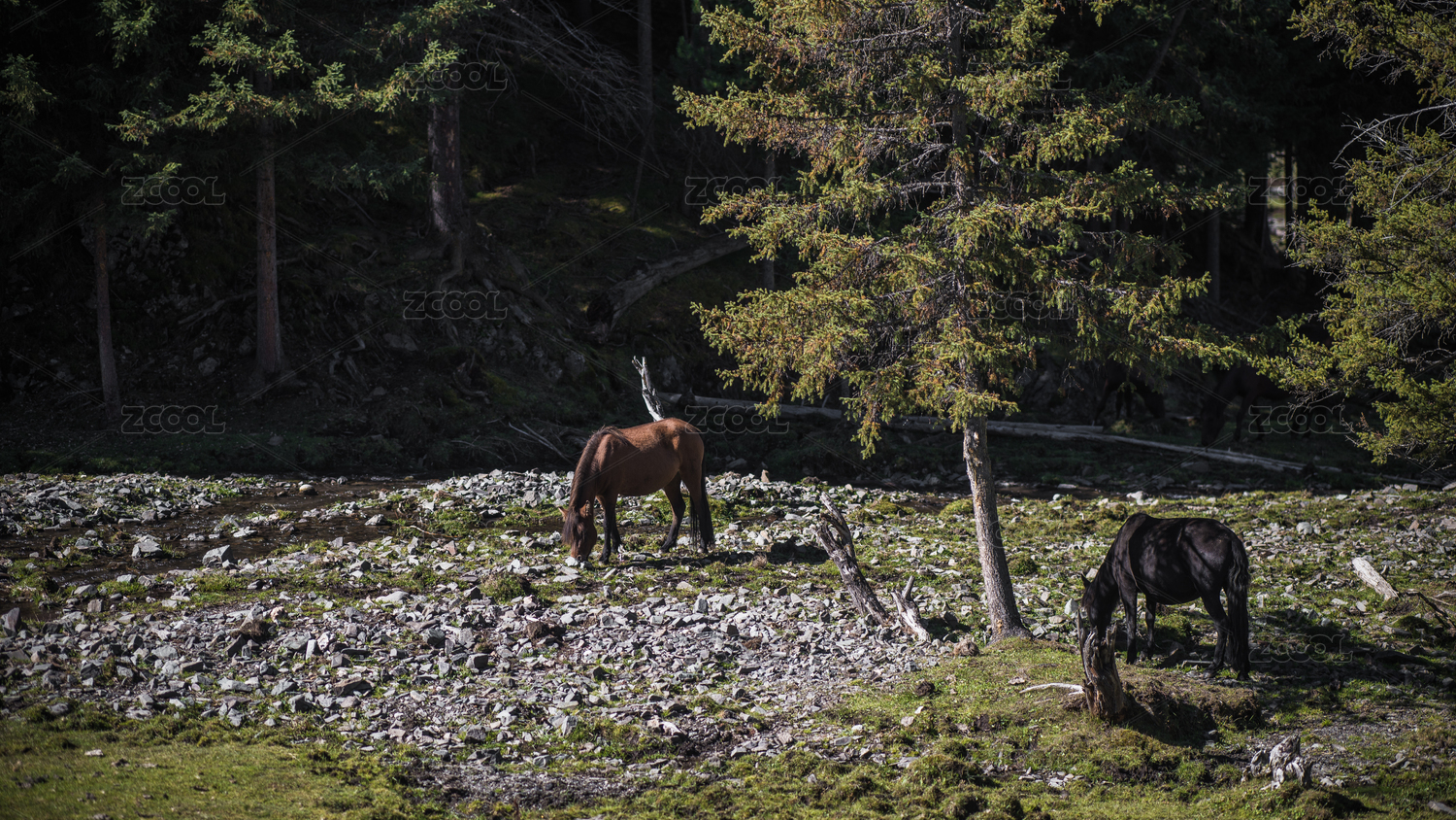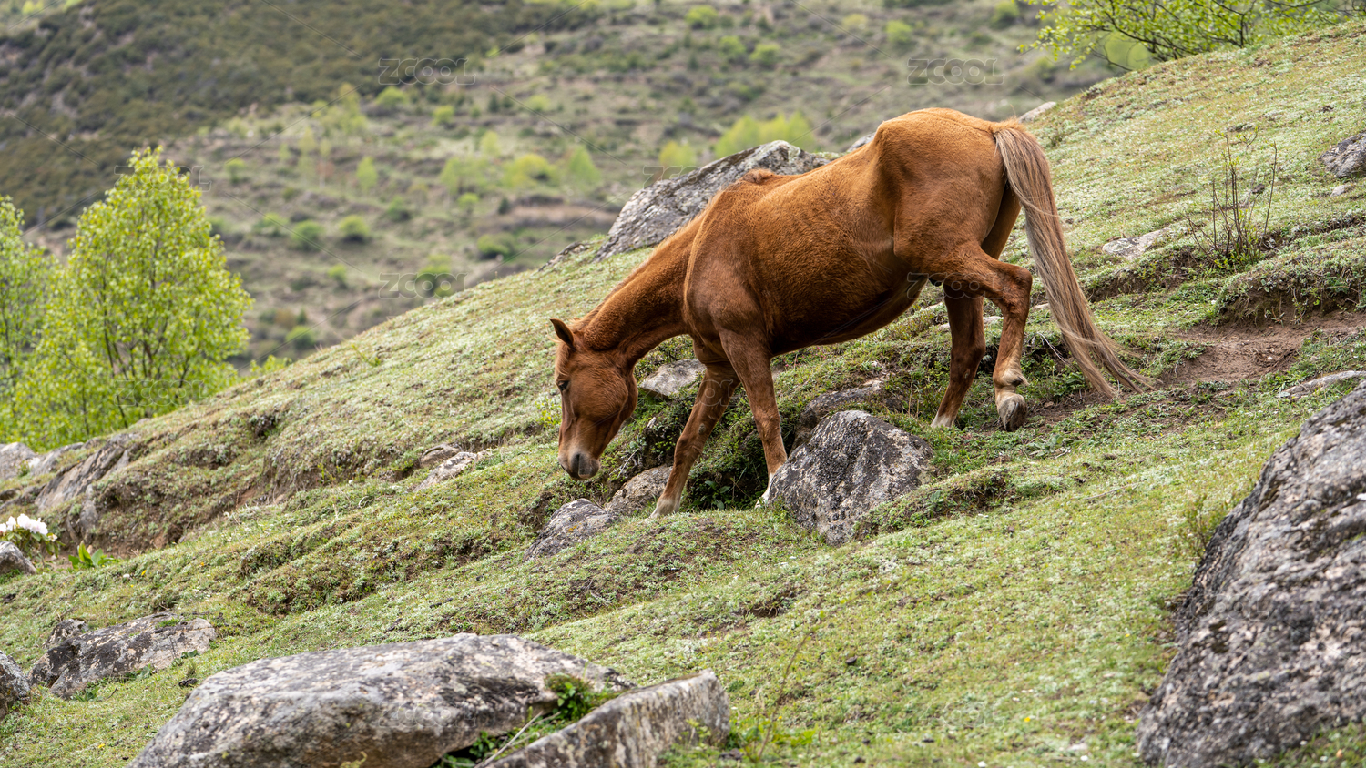 四川阿坝,海子沟,吃草,马匹,马,野外,动物,放养,牲畜,地形