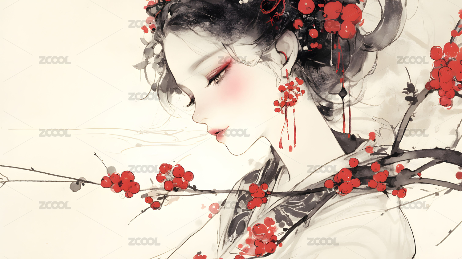 古典仕女红衣侧颜赏梅,尽显东方优雅韵味