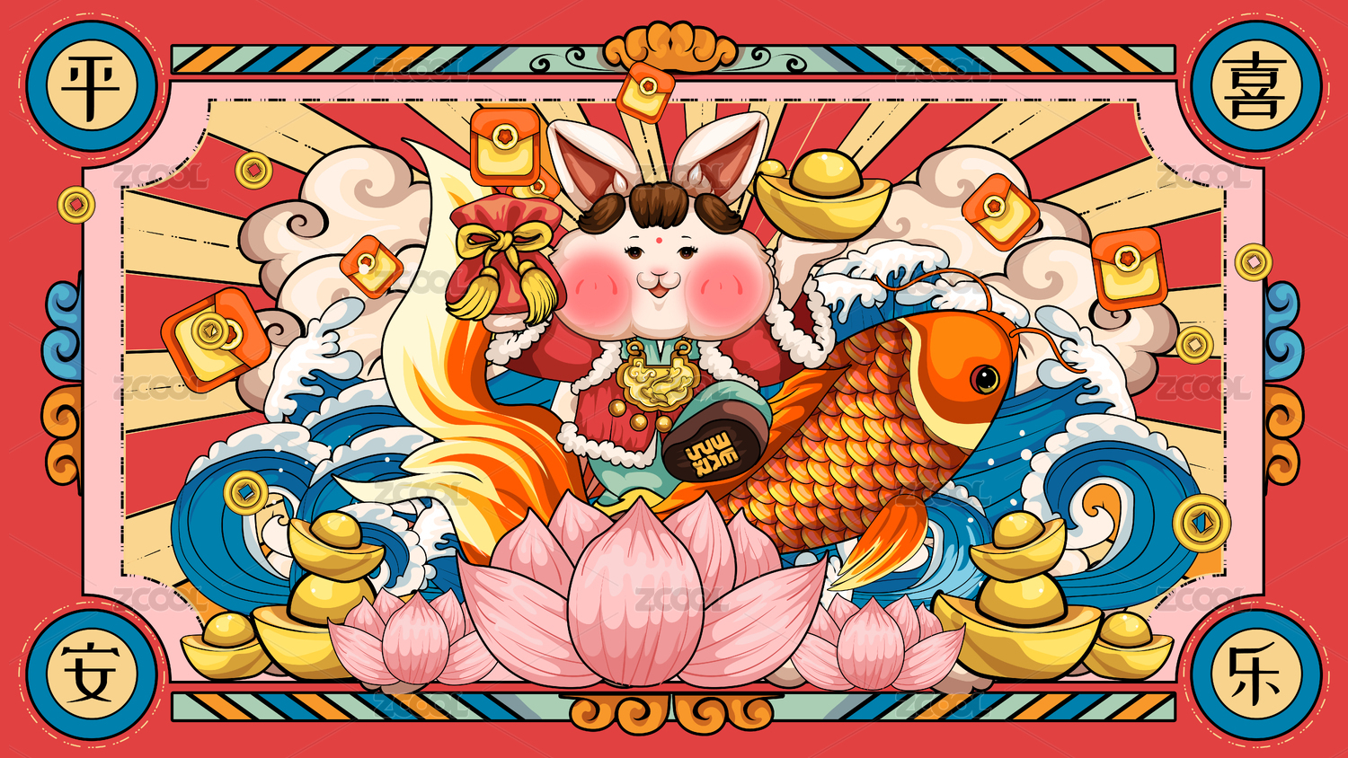 龙年锦鲤聚宝盆红色新年喜庆传统纹样边框