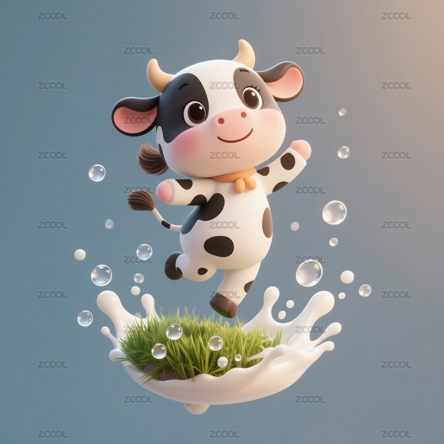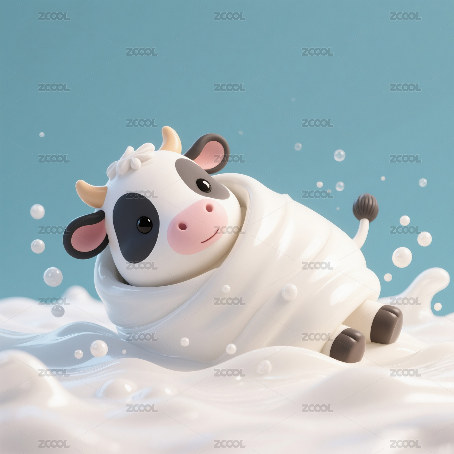 一只可爱的小奶牛在牛奶中跳舞