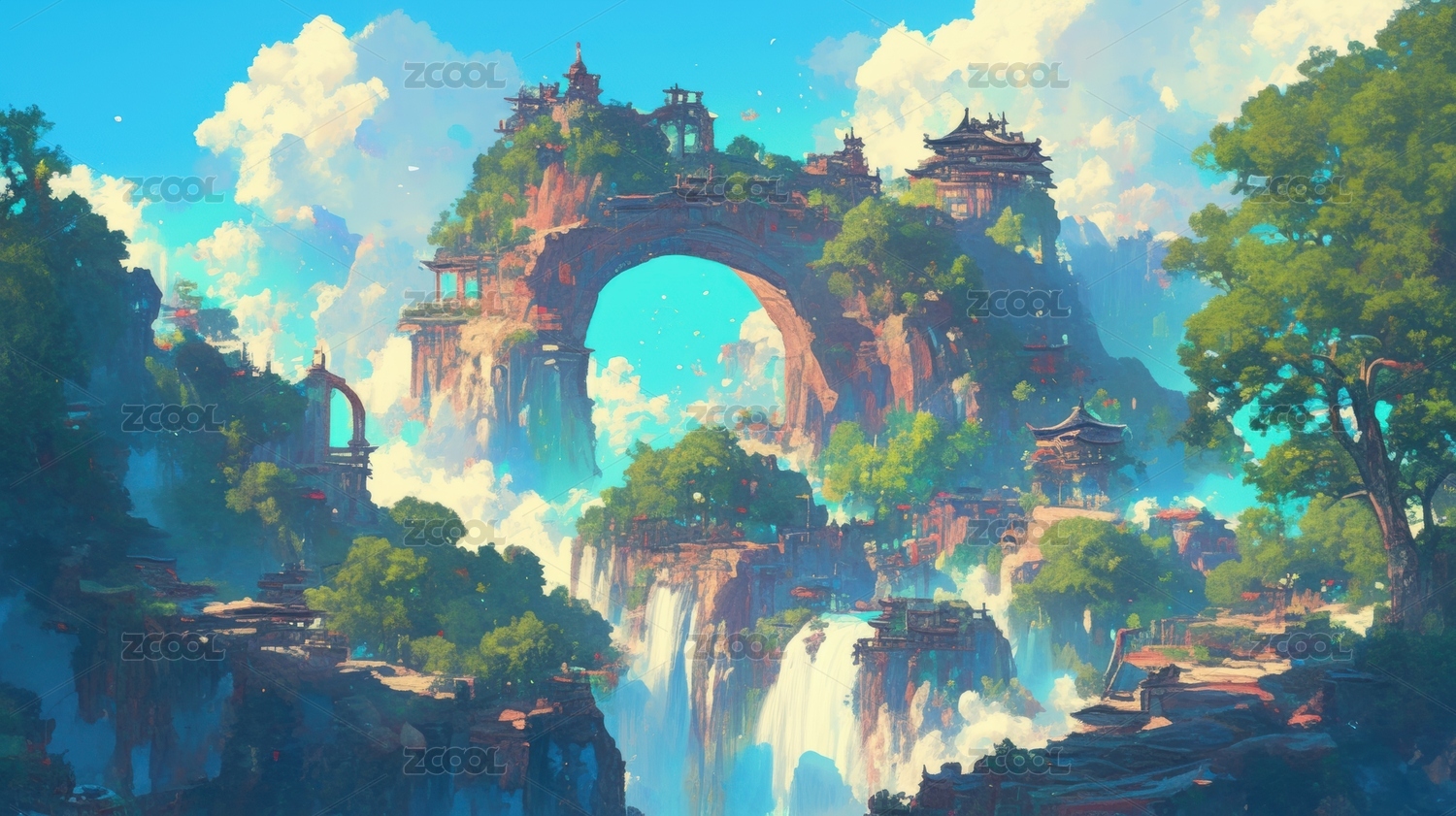 梦幻山水中的古建筑拱门