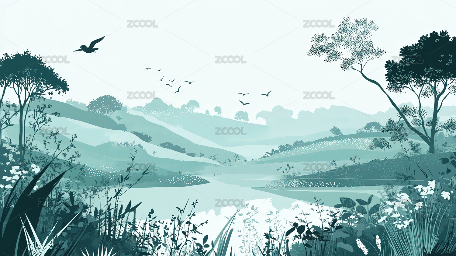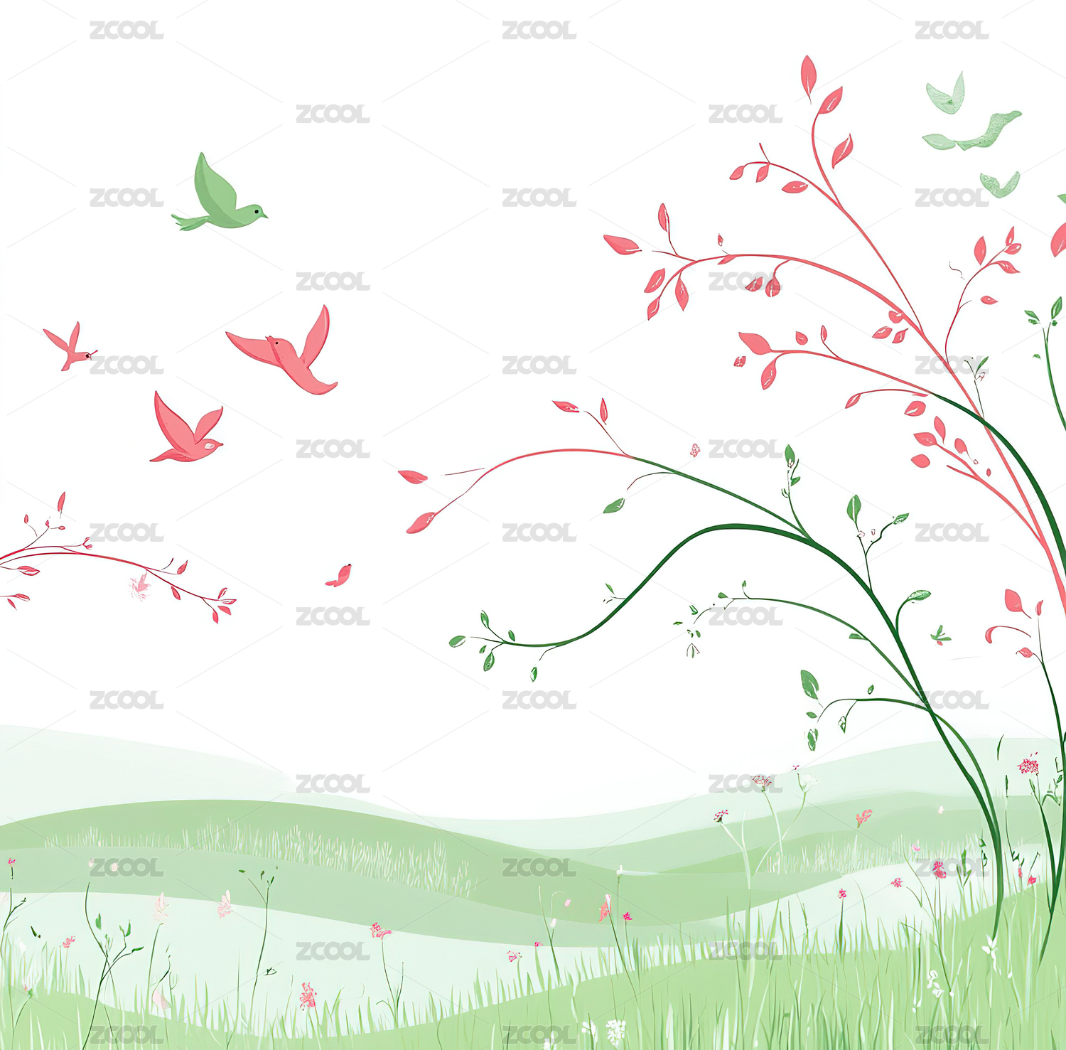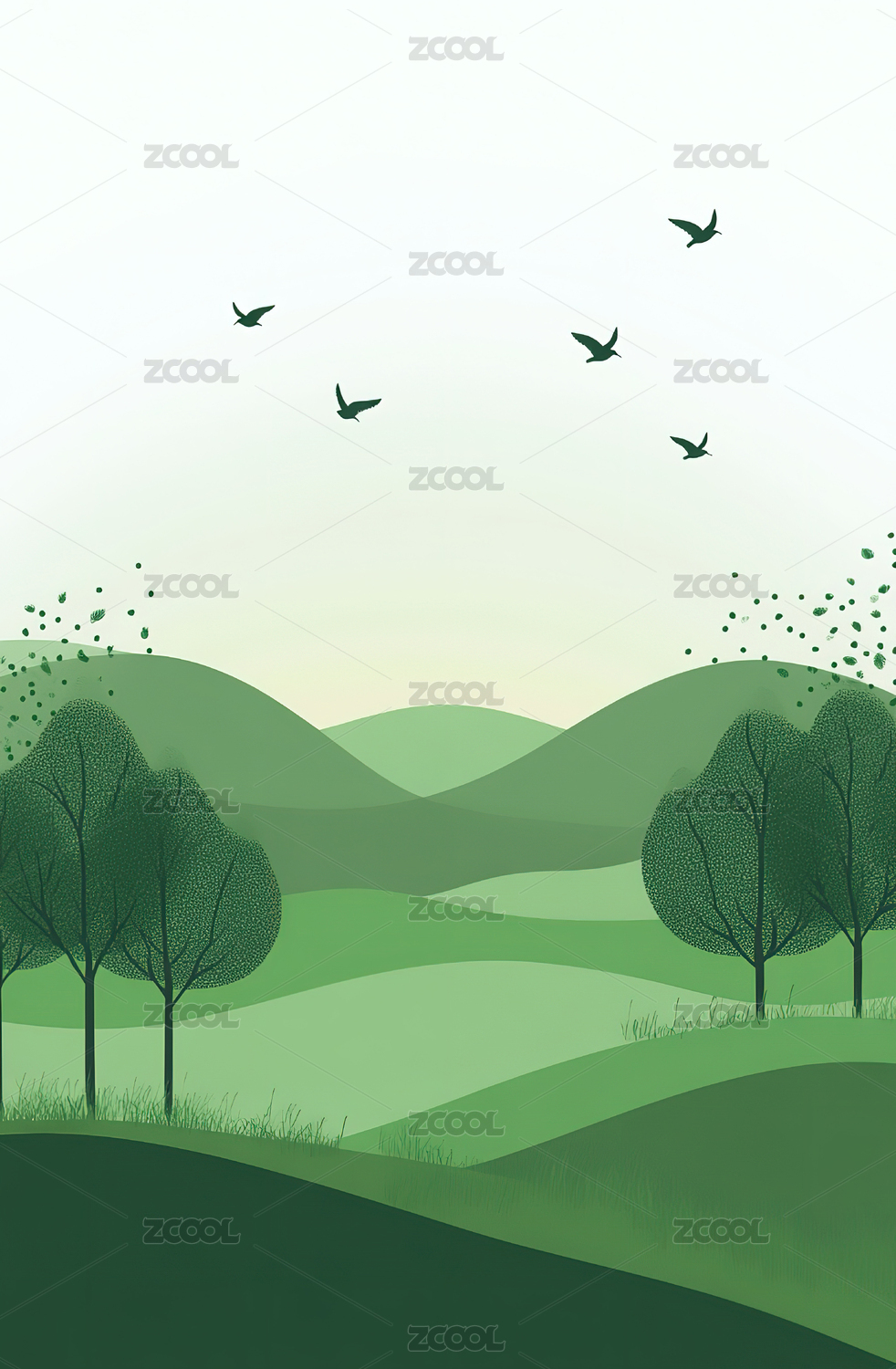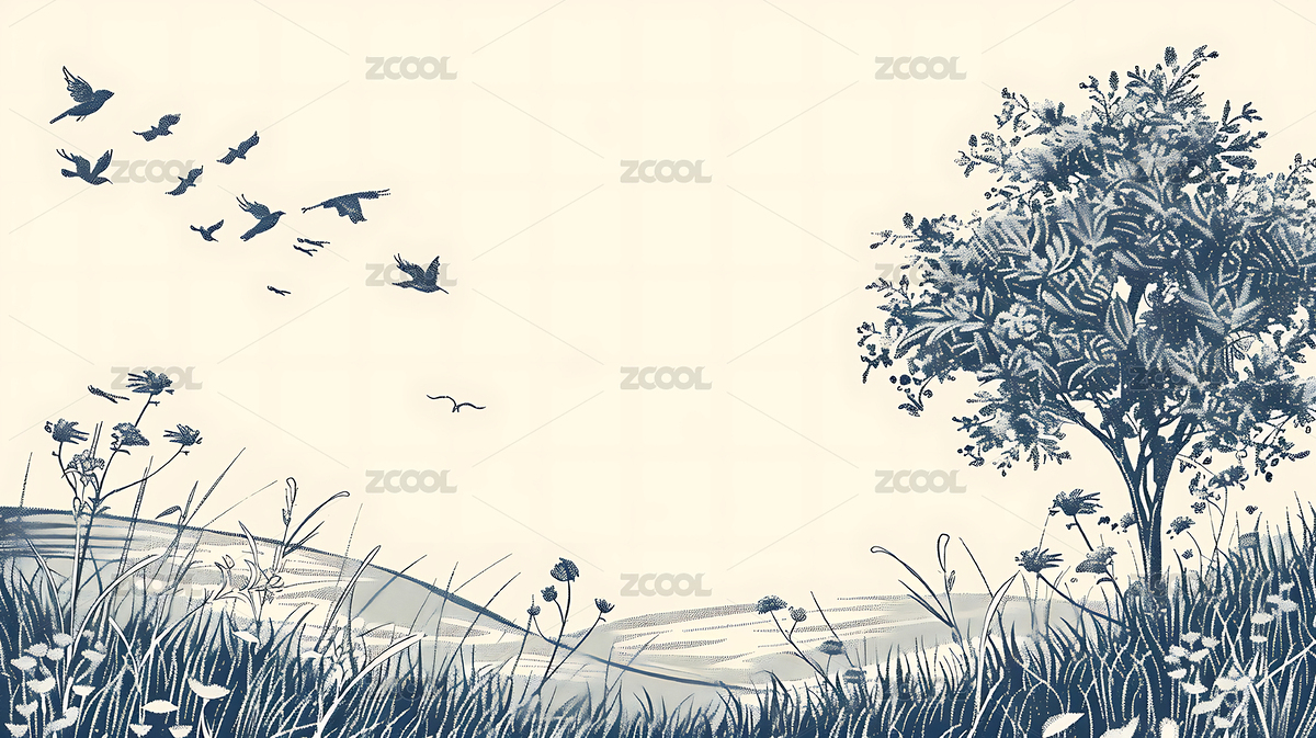 繁茂的树木与飞翔的鸟儿插画