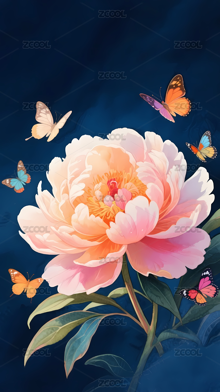 码复古牡丹和花蕾纹理图形海报手机端背景