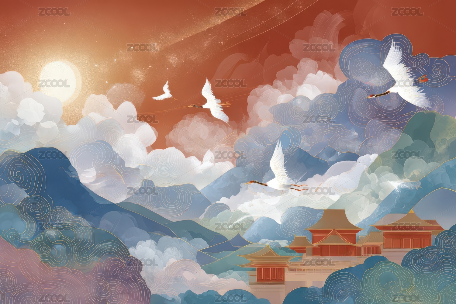 仙鹤翱翔云间古建筑美景