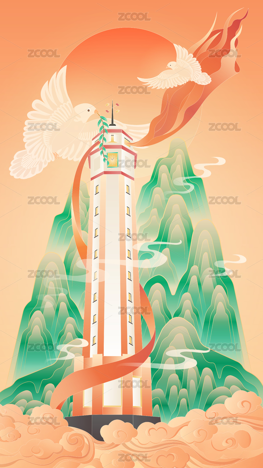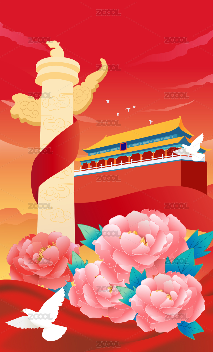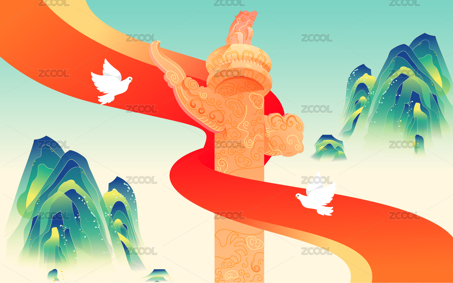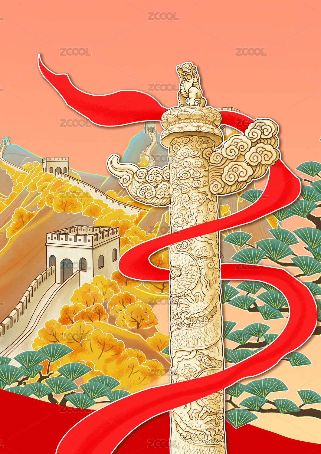 华表长城青松红飘带庆祝国庆 国风插画