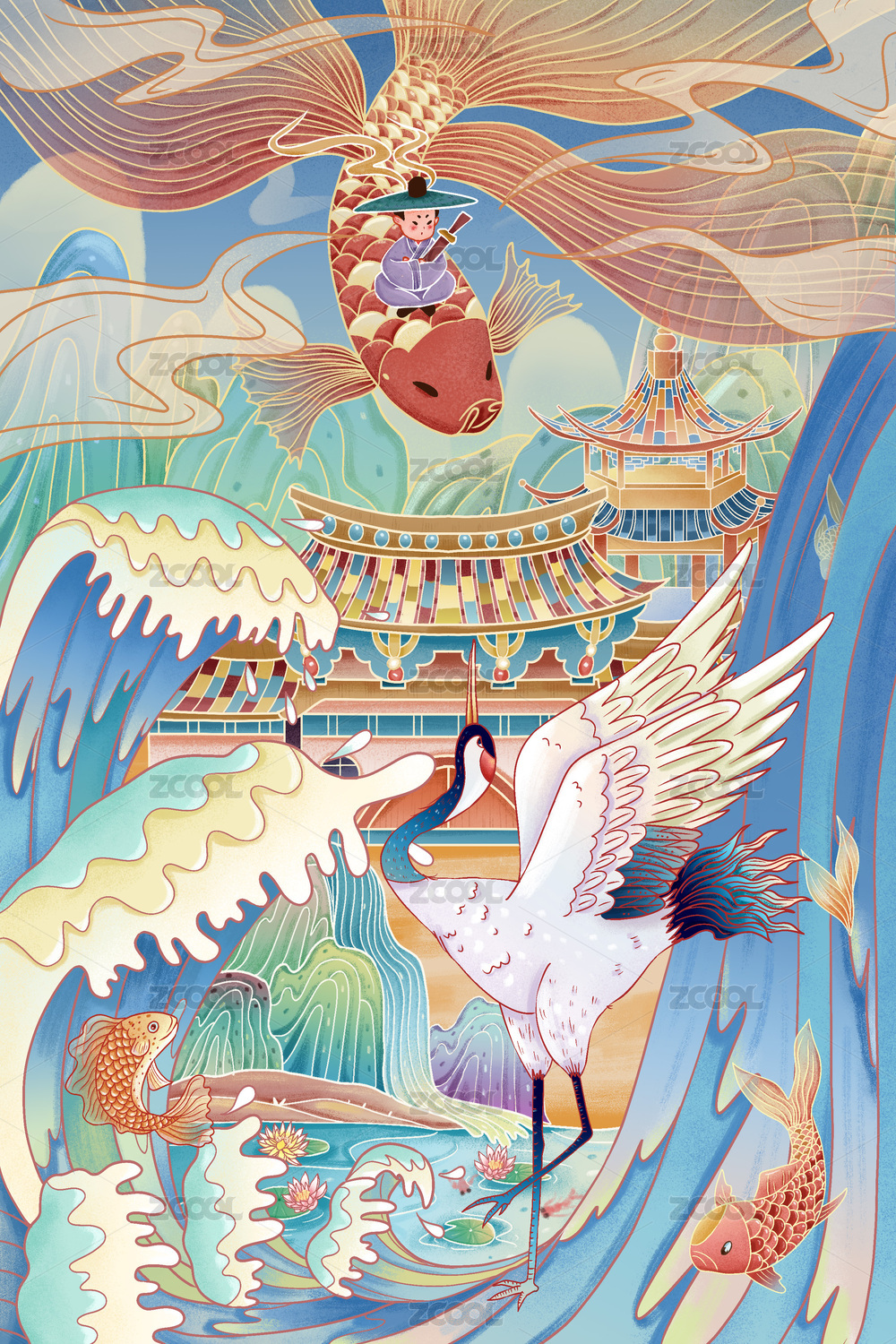 古风男孩坐飞鱼上与仙鹤交流