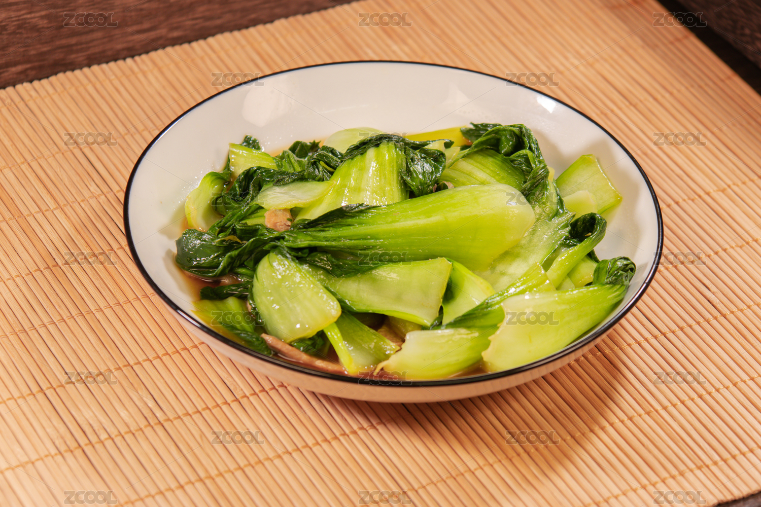 盛放在白瓷盘里的清炒小白菜
