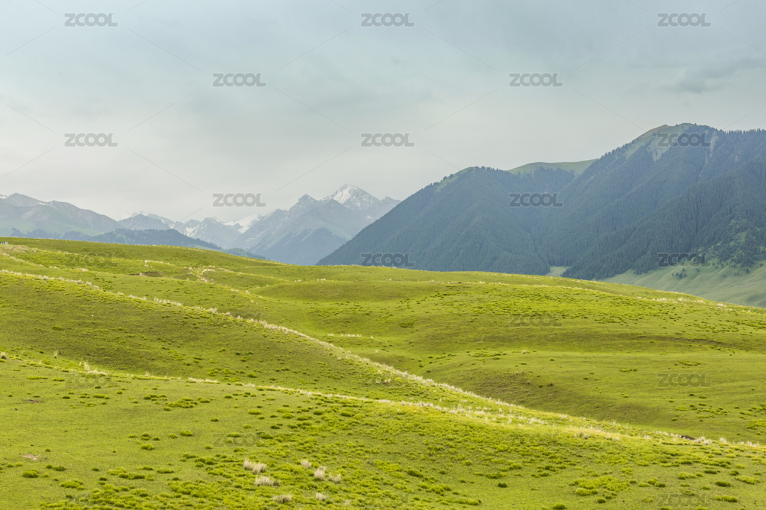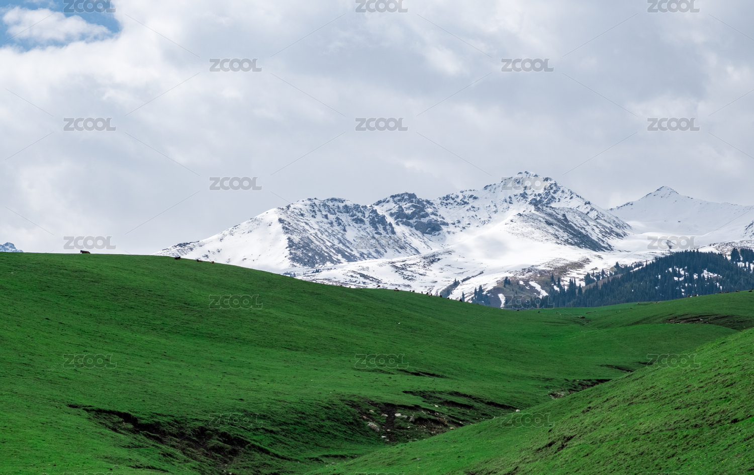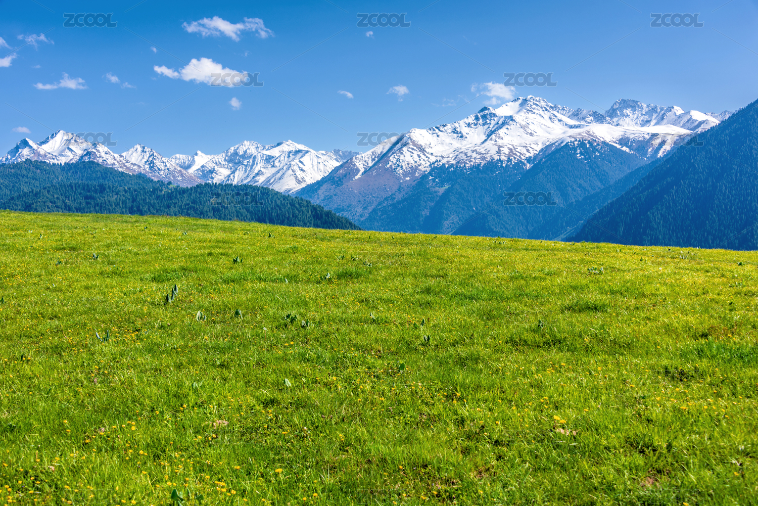 中国新疆下塔风景区雄伟的山脉和绿色的草原