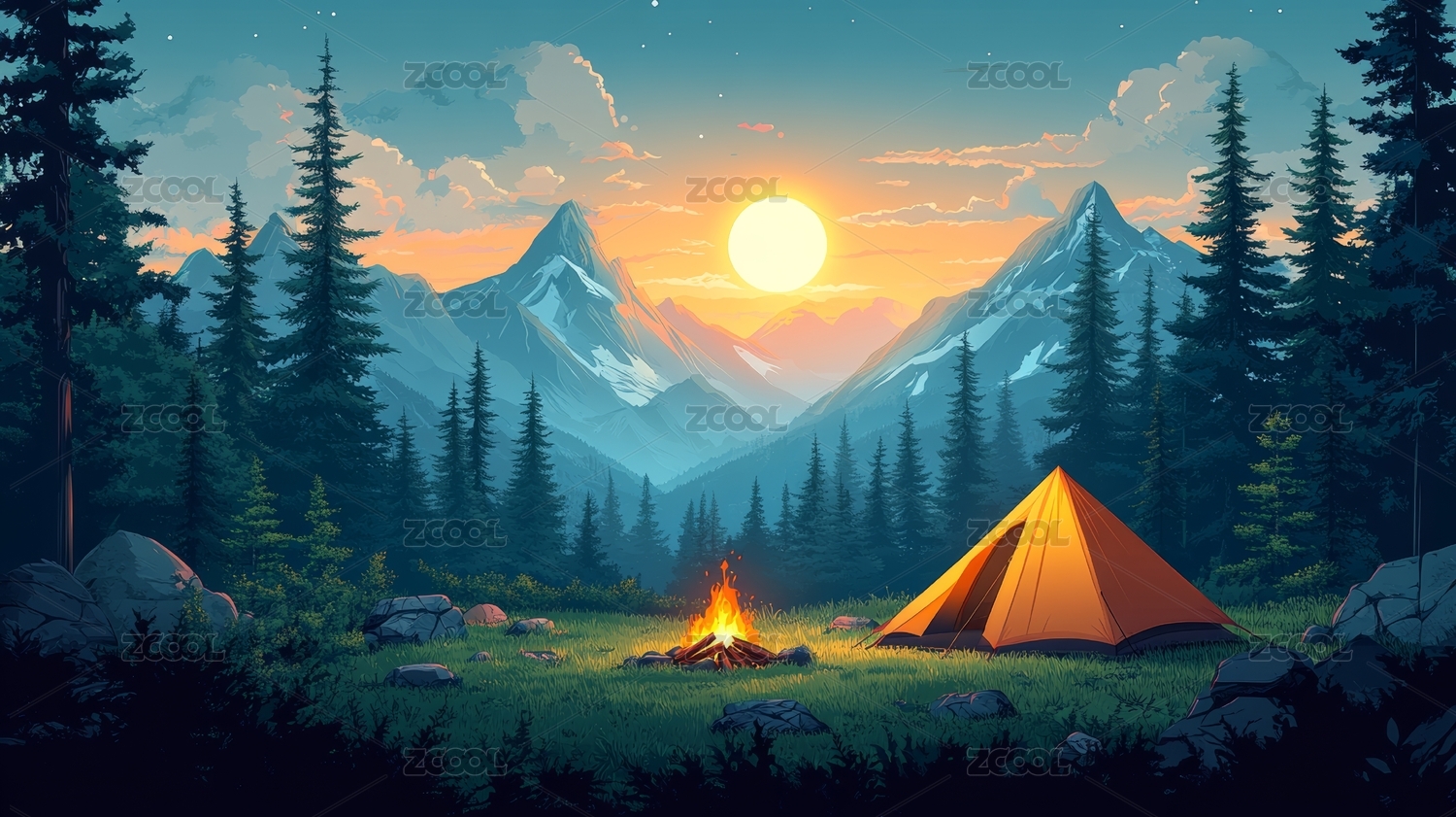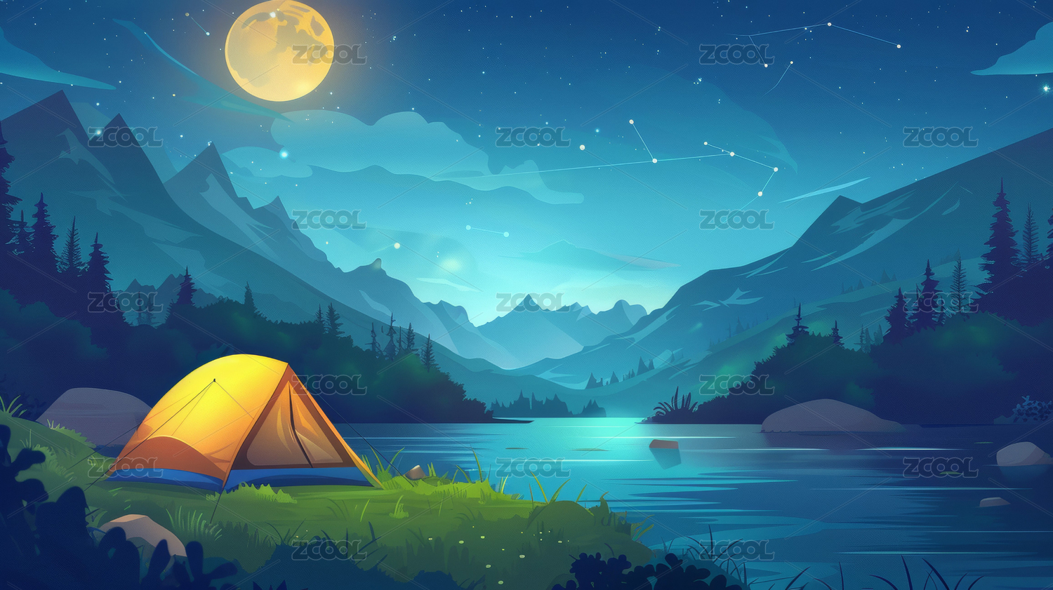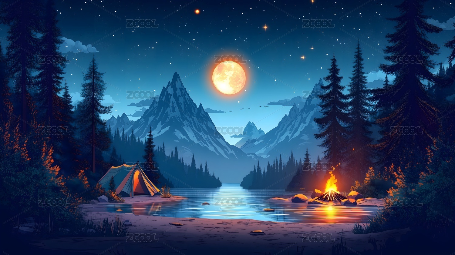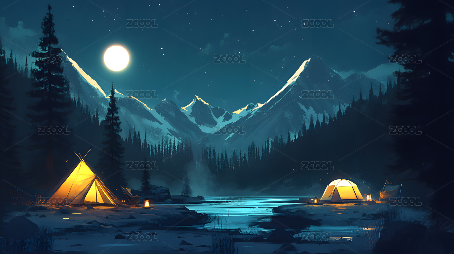 夜晚,露营,户外,帐篷,插画,风景,高山,自然,树,地形