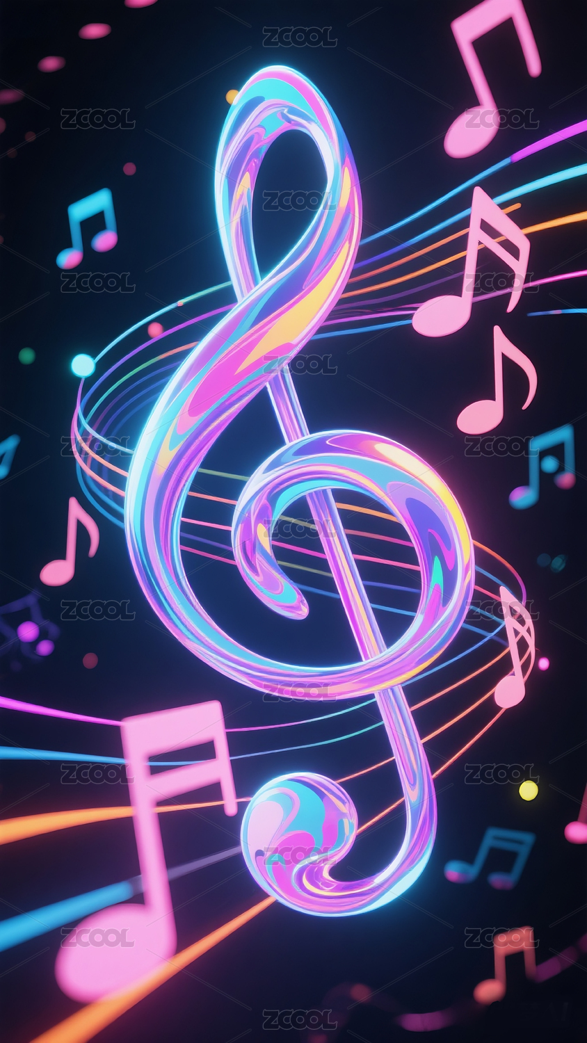 音乐音符与霓虹灯光效果3D渲染