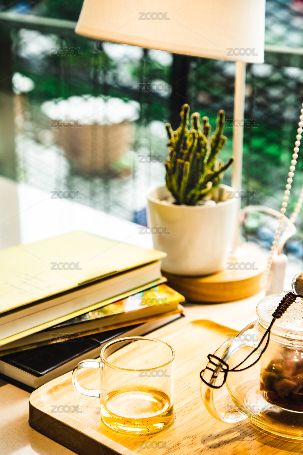 生活方式主题:特写落地窗边大理石桌上放着书本,台灯,仙人掌和花茶等