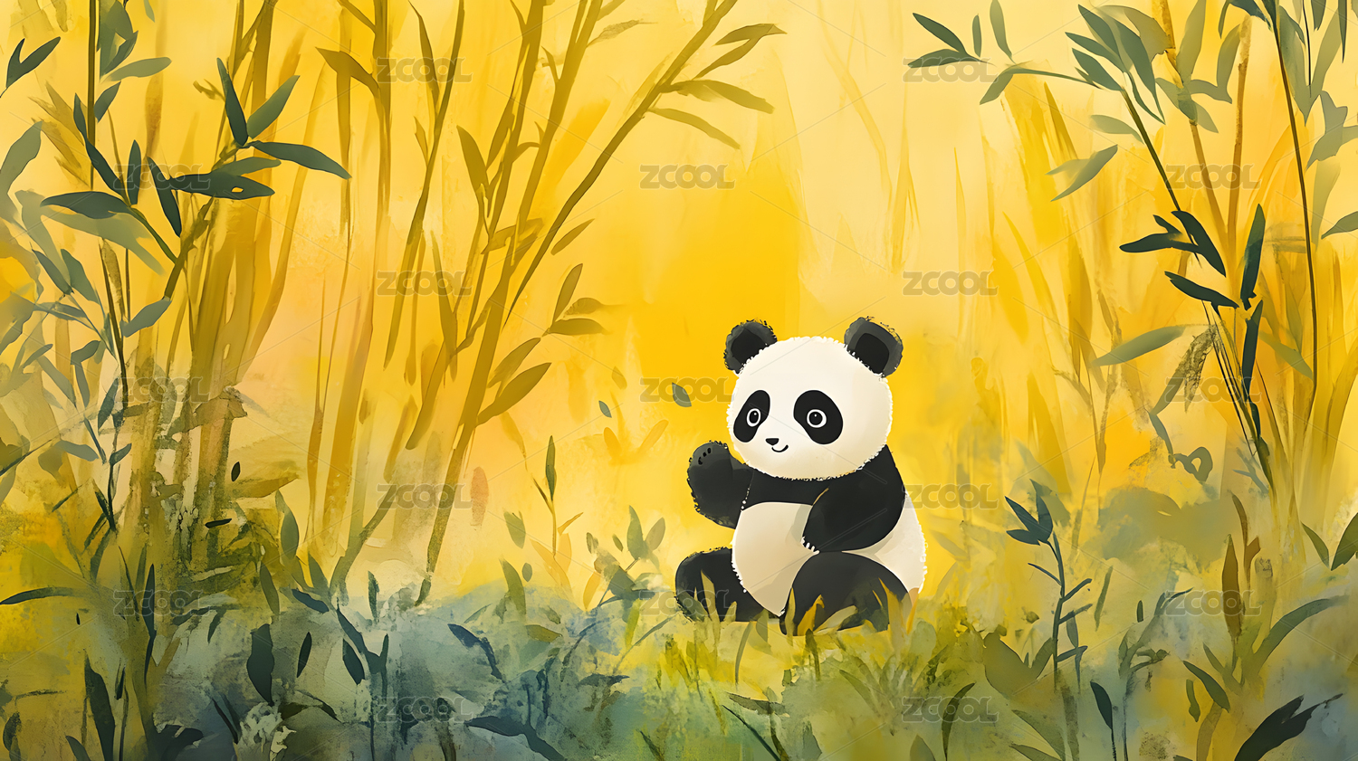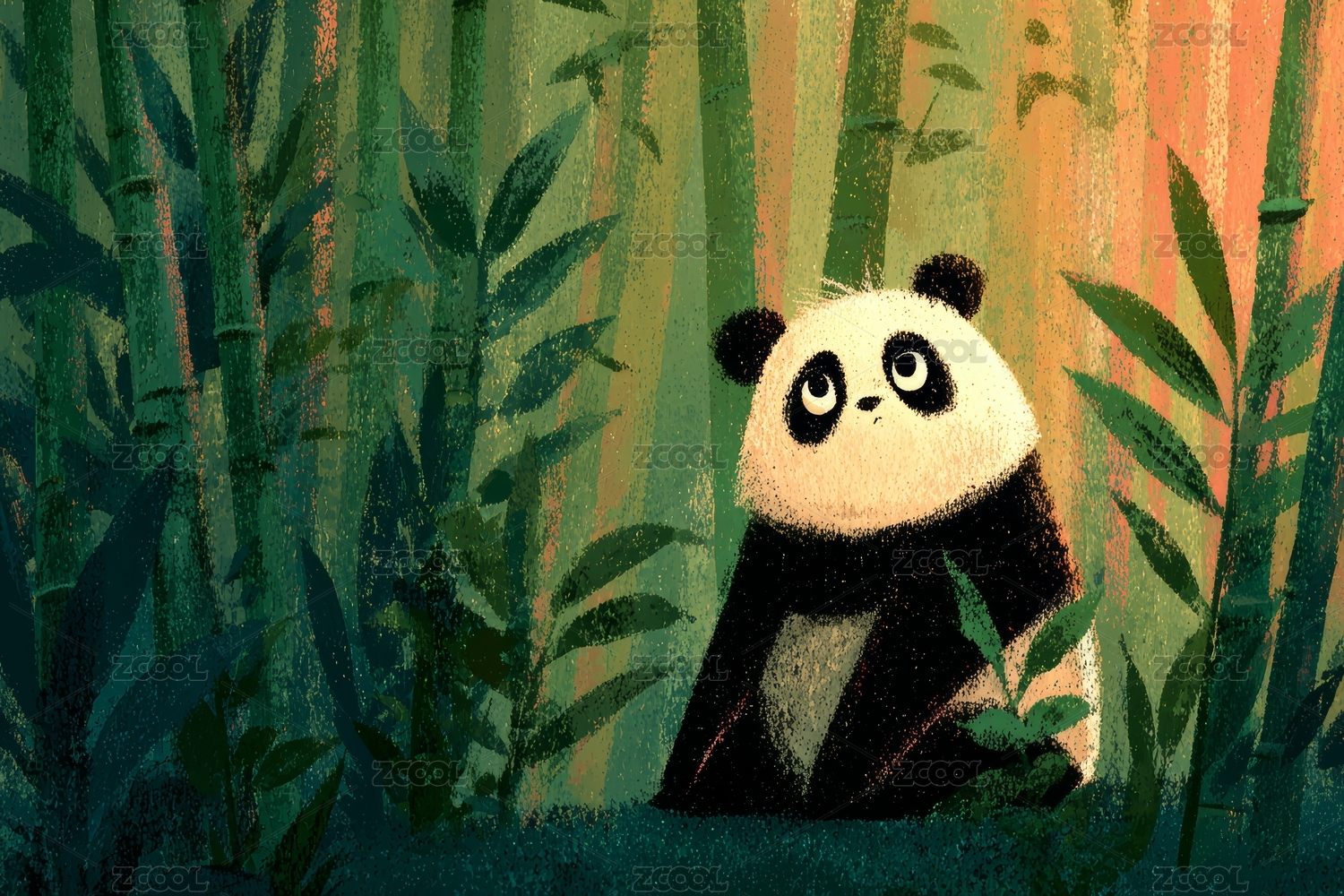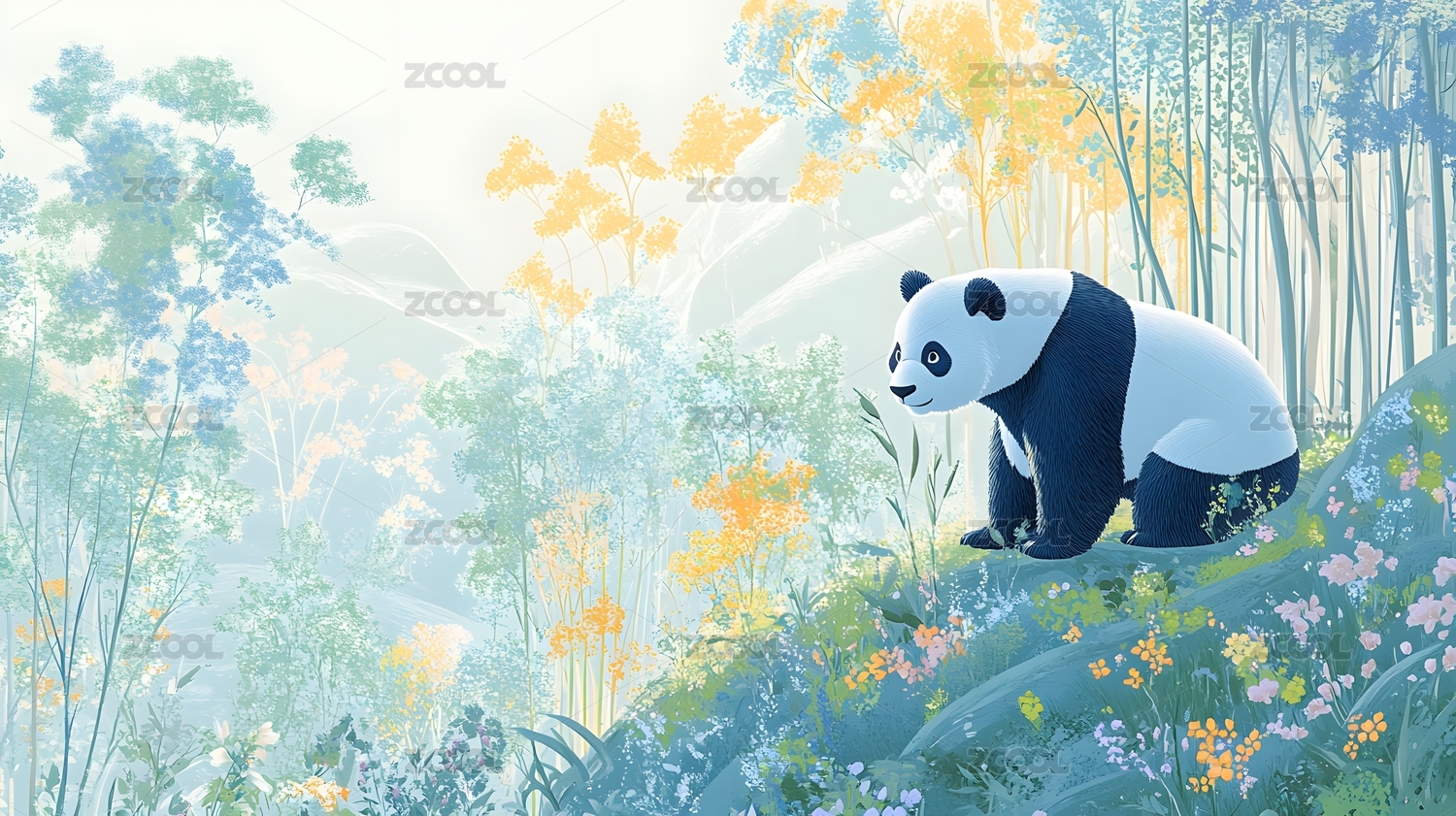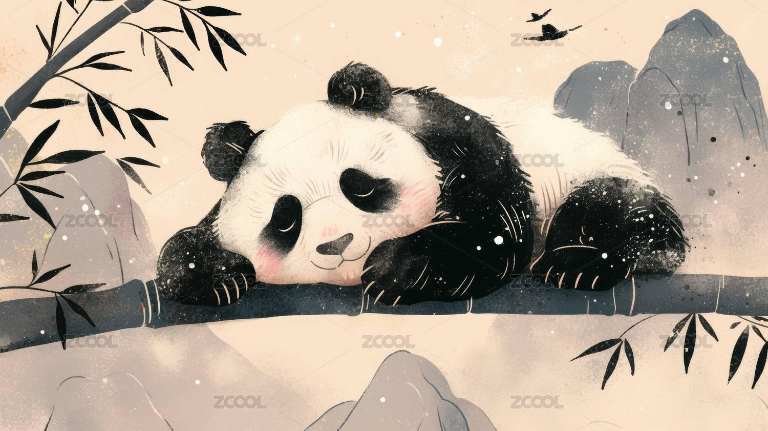 可爱熊猫与小鸟静坐枝头 绿色森林氛围