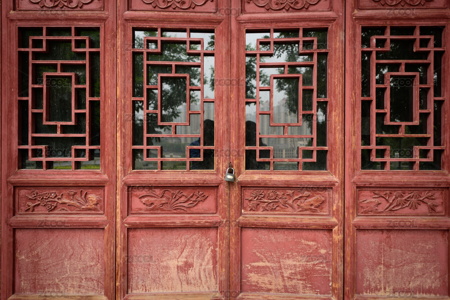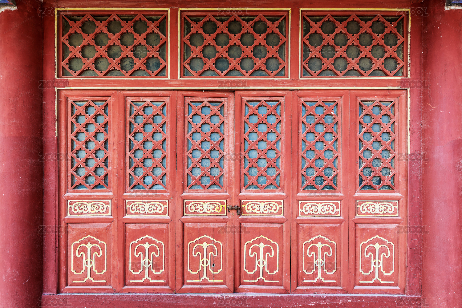 中国北京故宫宫殿红色的镶有窗格的门特写