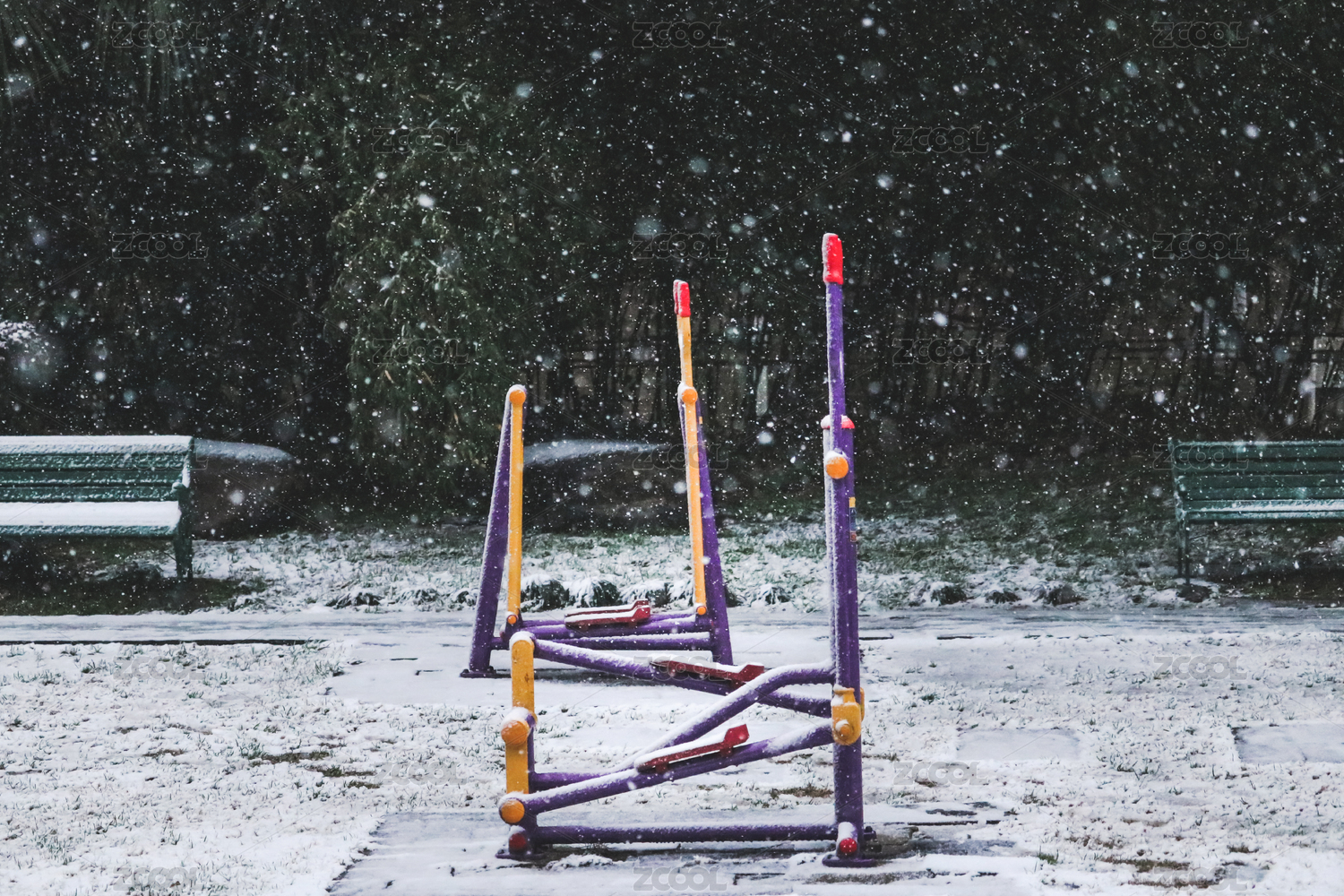 冬日公园长椅落雪景色