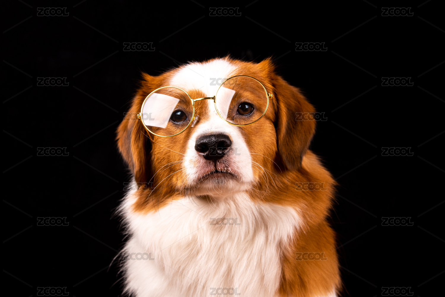 一只在黑色背景前戴着眼镜的小狗