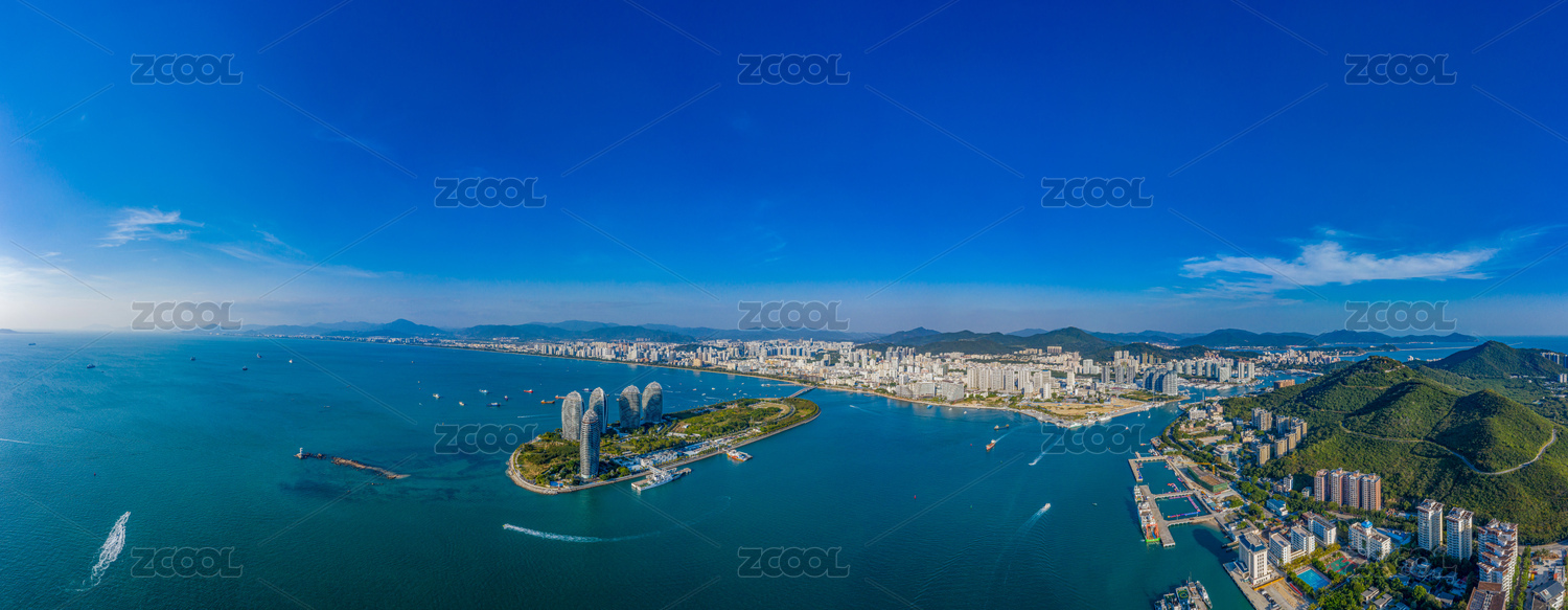 航拍海南三亚凤凰岛碧海蓝天海面吹填人工岛