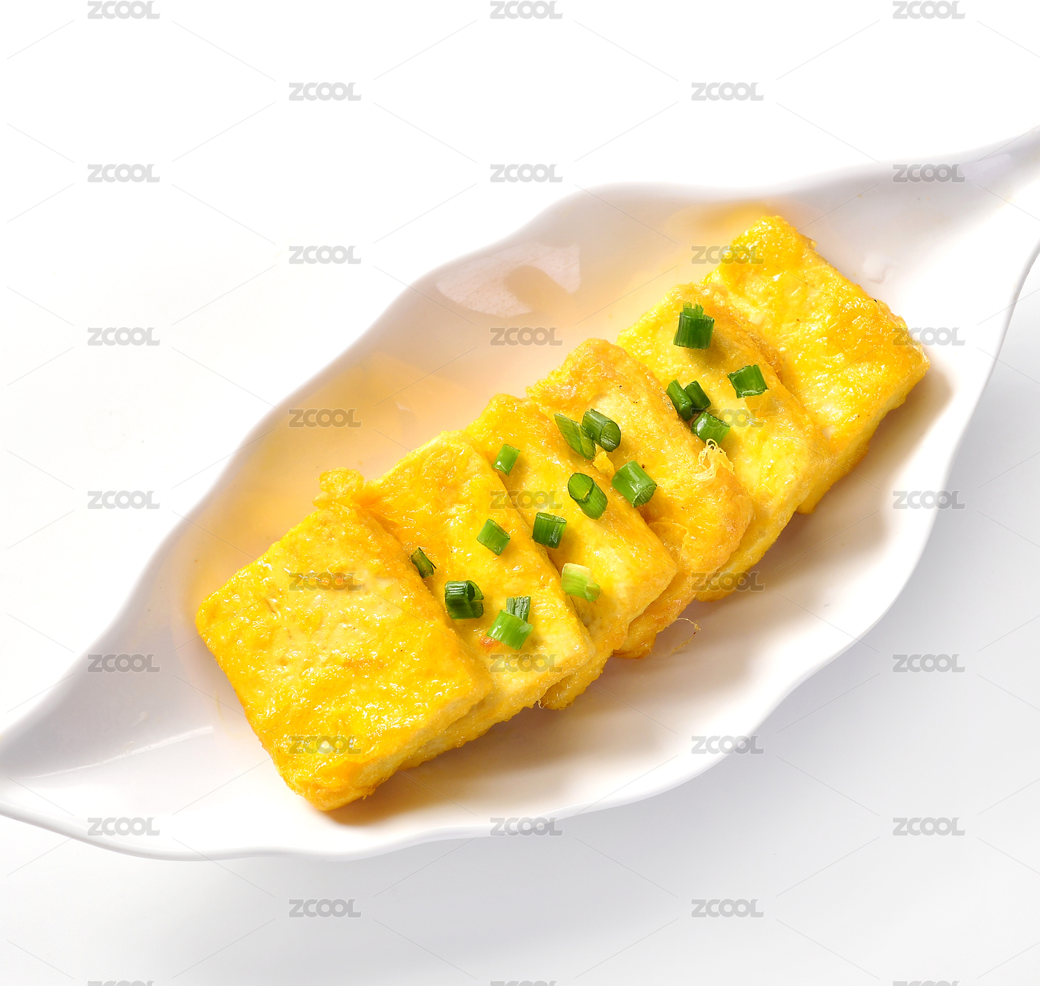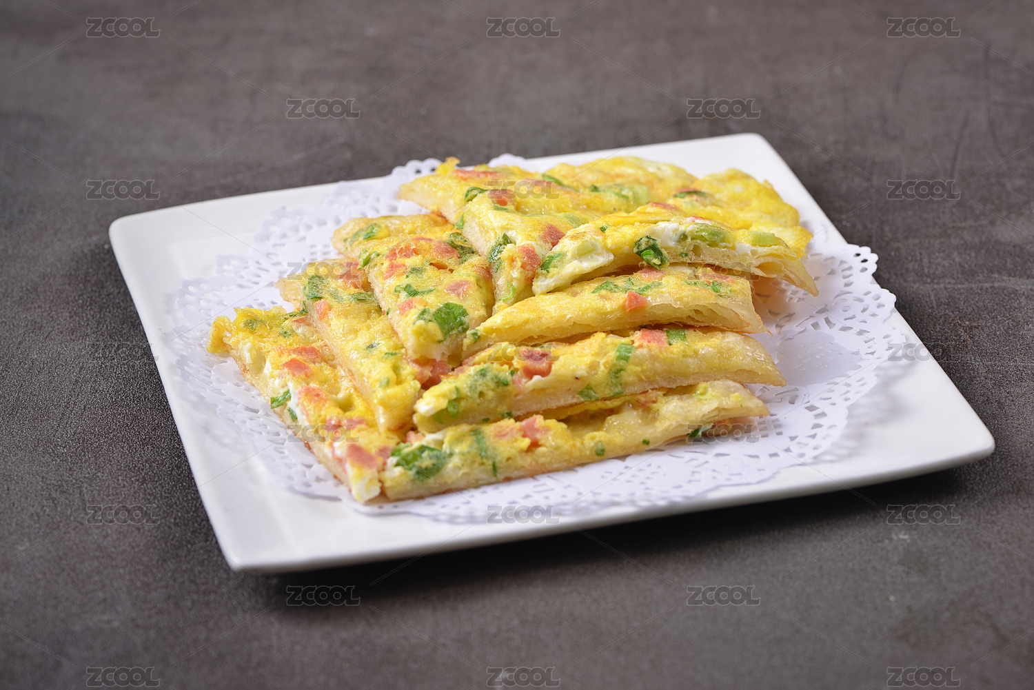 蔬菜鸡蛋摊饼摆放在白色背景上