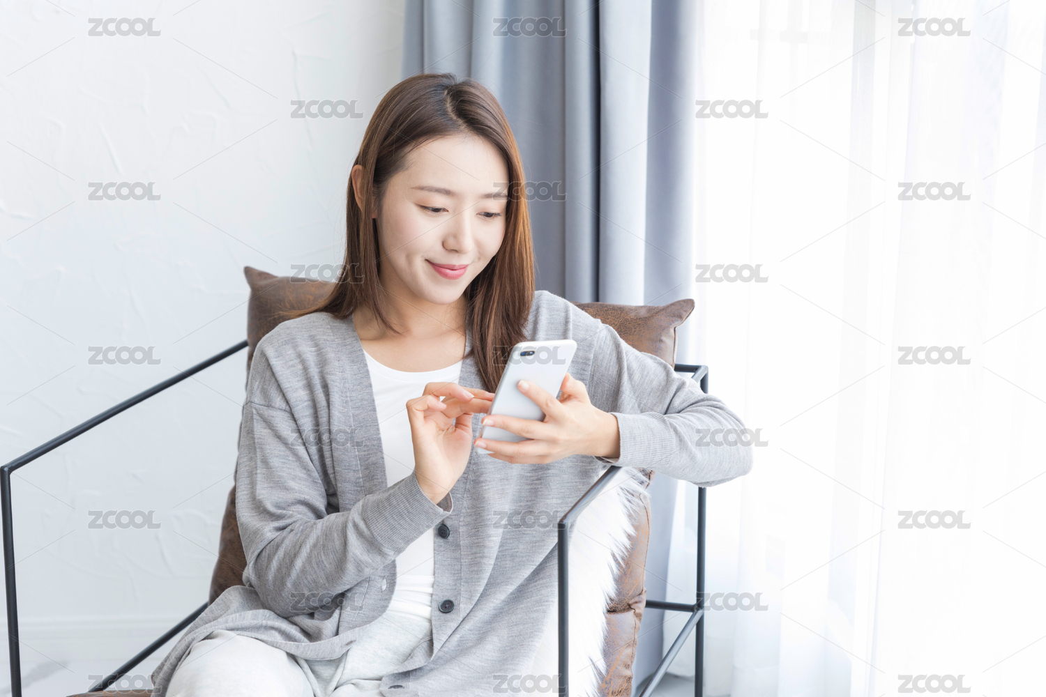 一名年轻女性坐在客厅窗边的沙发椅上玩手机