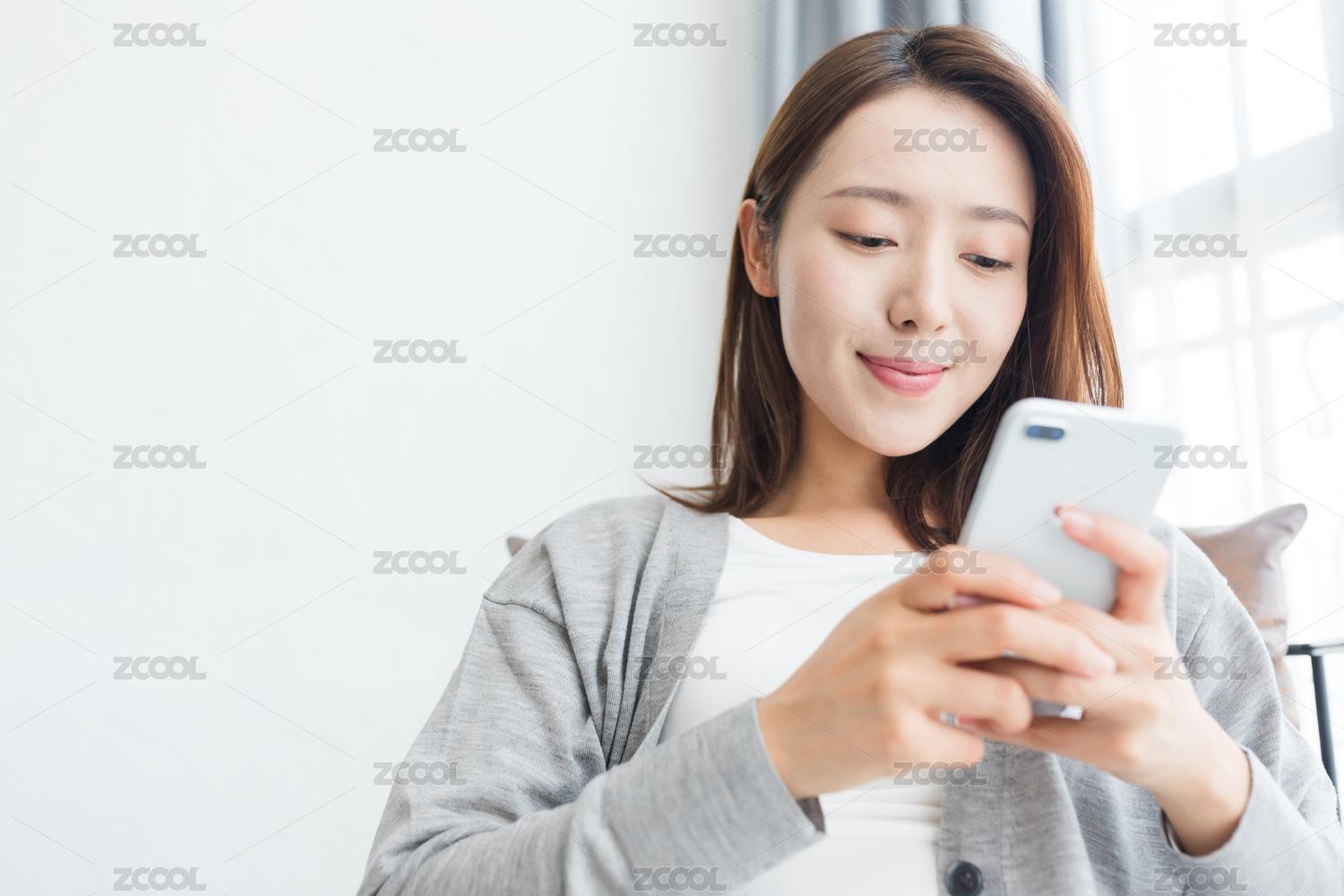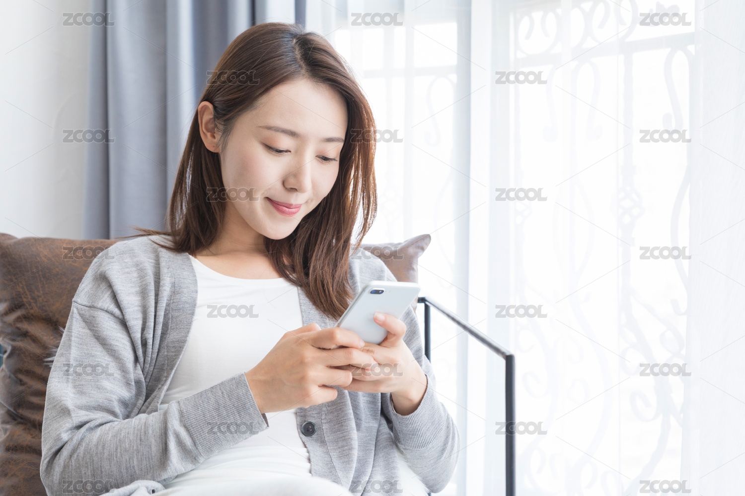 假期里一名年轻女性在窗边使用手机看电影追剧