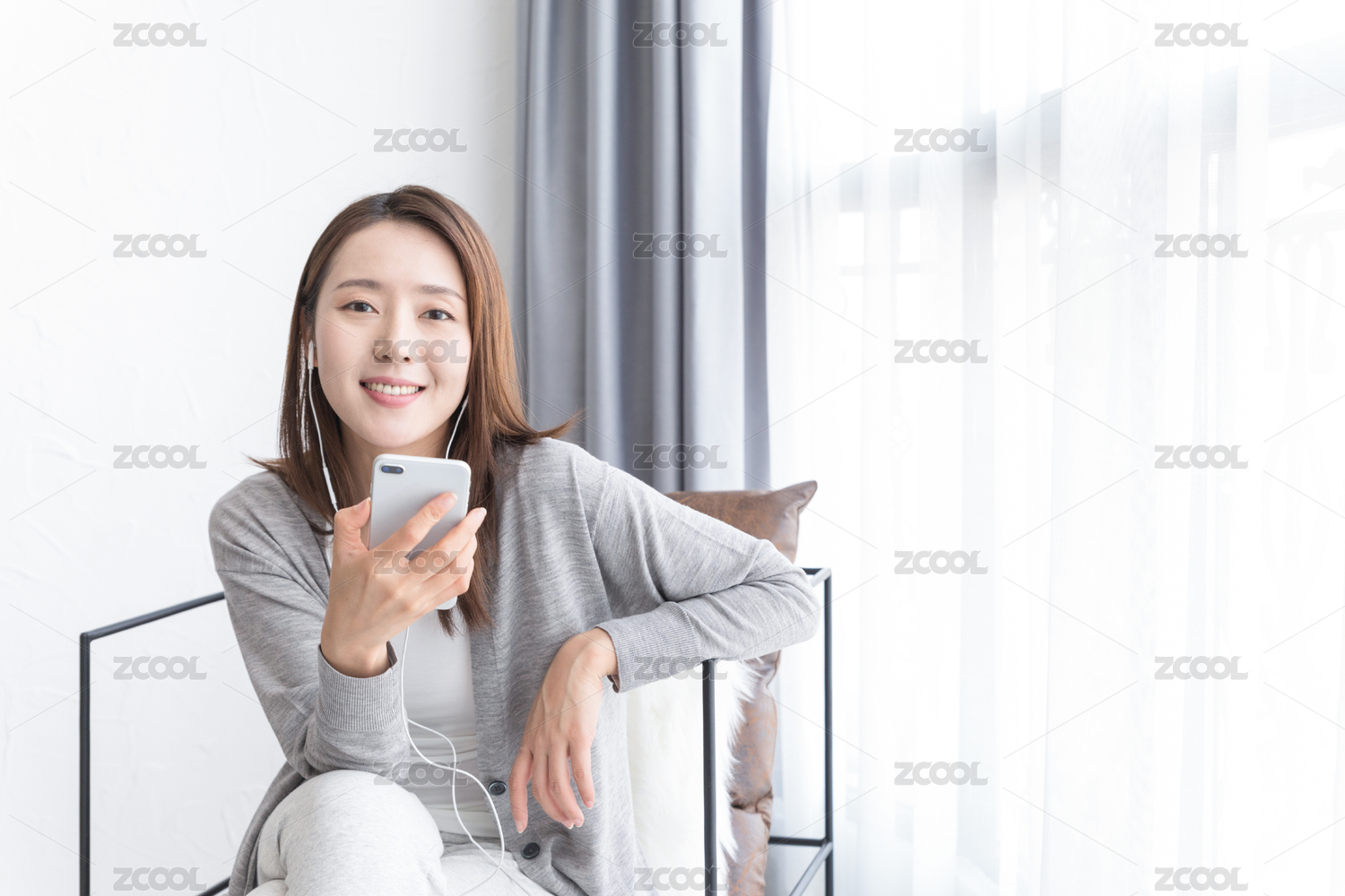 一名年轻女性坐在靠窗的沙发椅上用手机听音乐