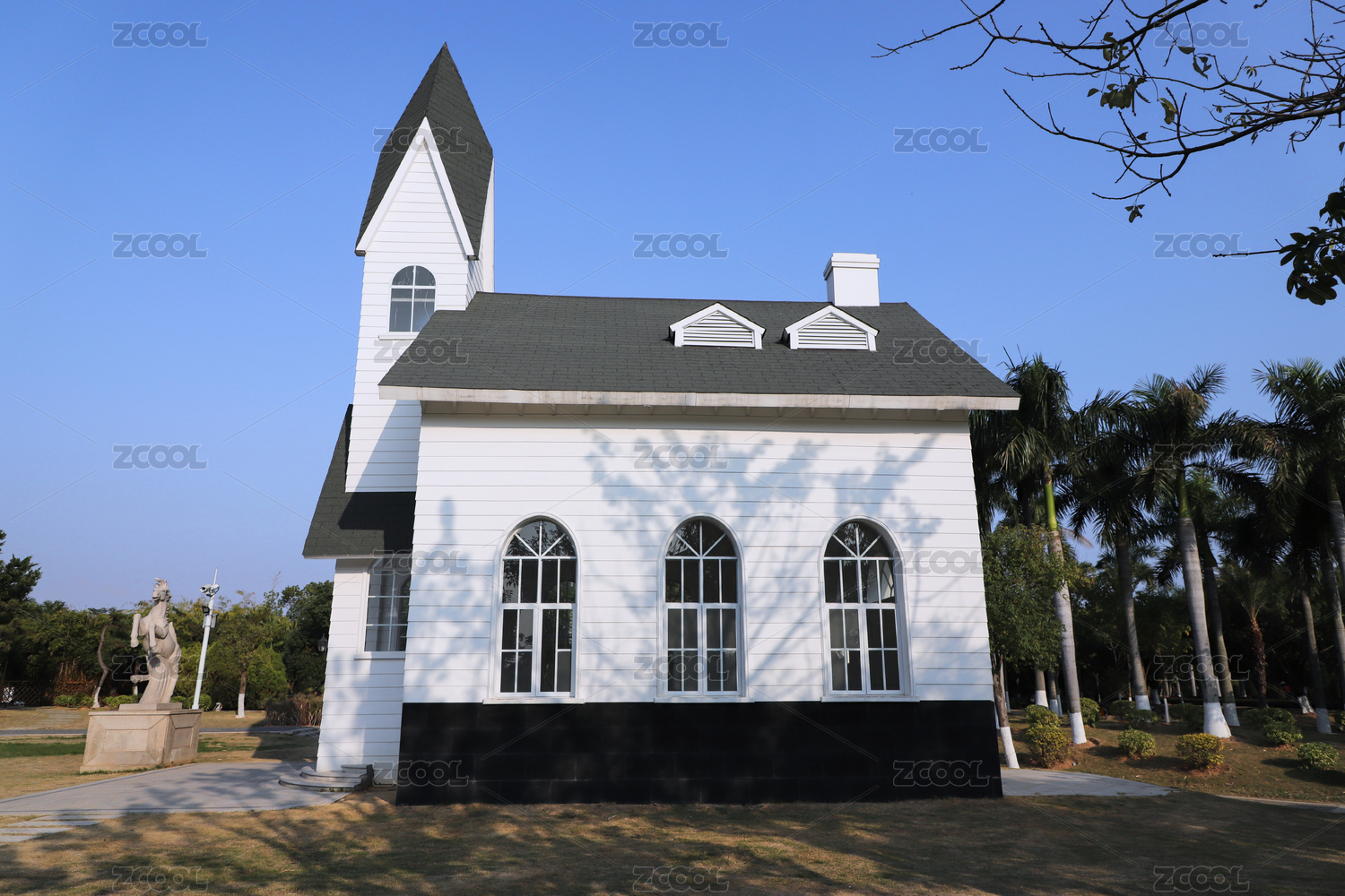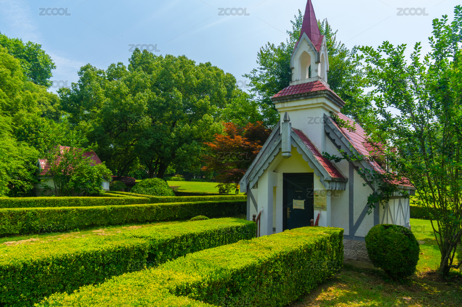 中国广东东莞凤岗龙凤山庄里的花圃与教堂