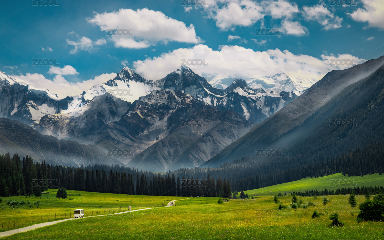 中国新疆昭苏夏塔古道的山谷雪山草原