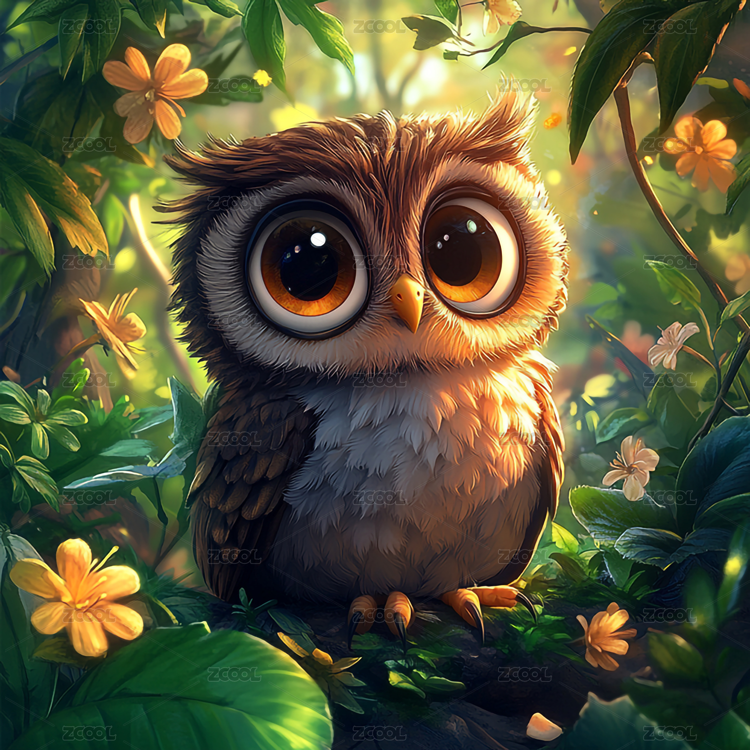在丛林枝头上站立的卡通猫头鹰头像插画