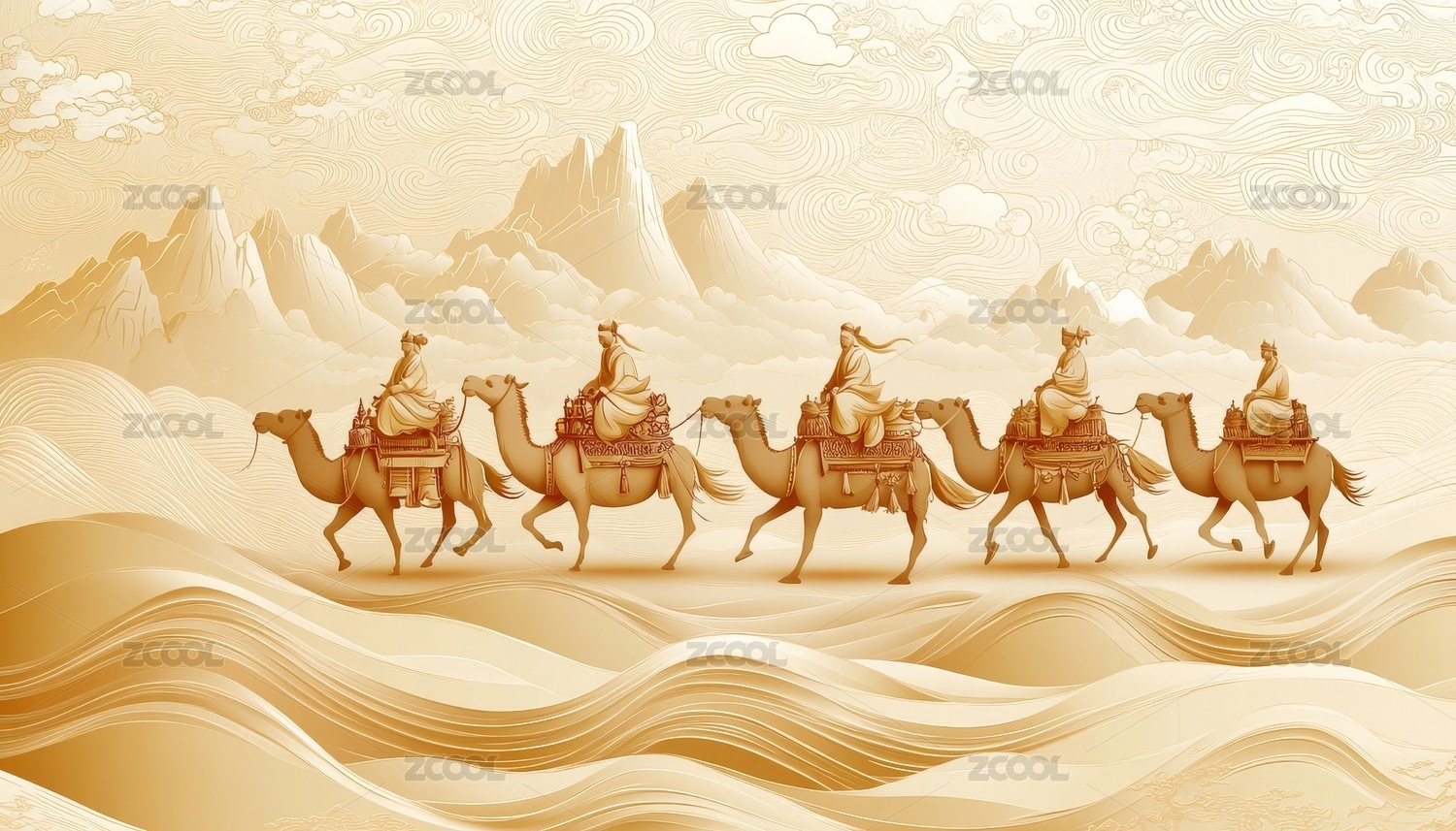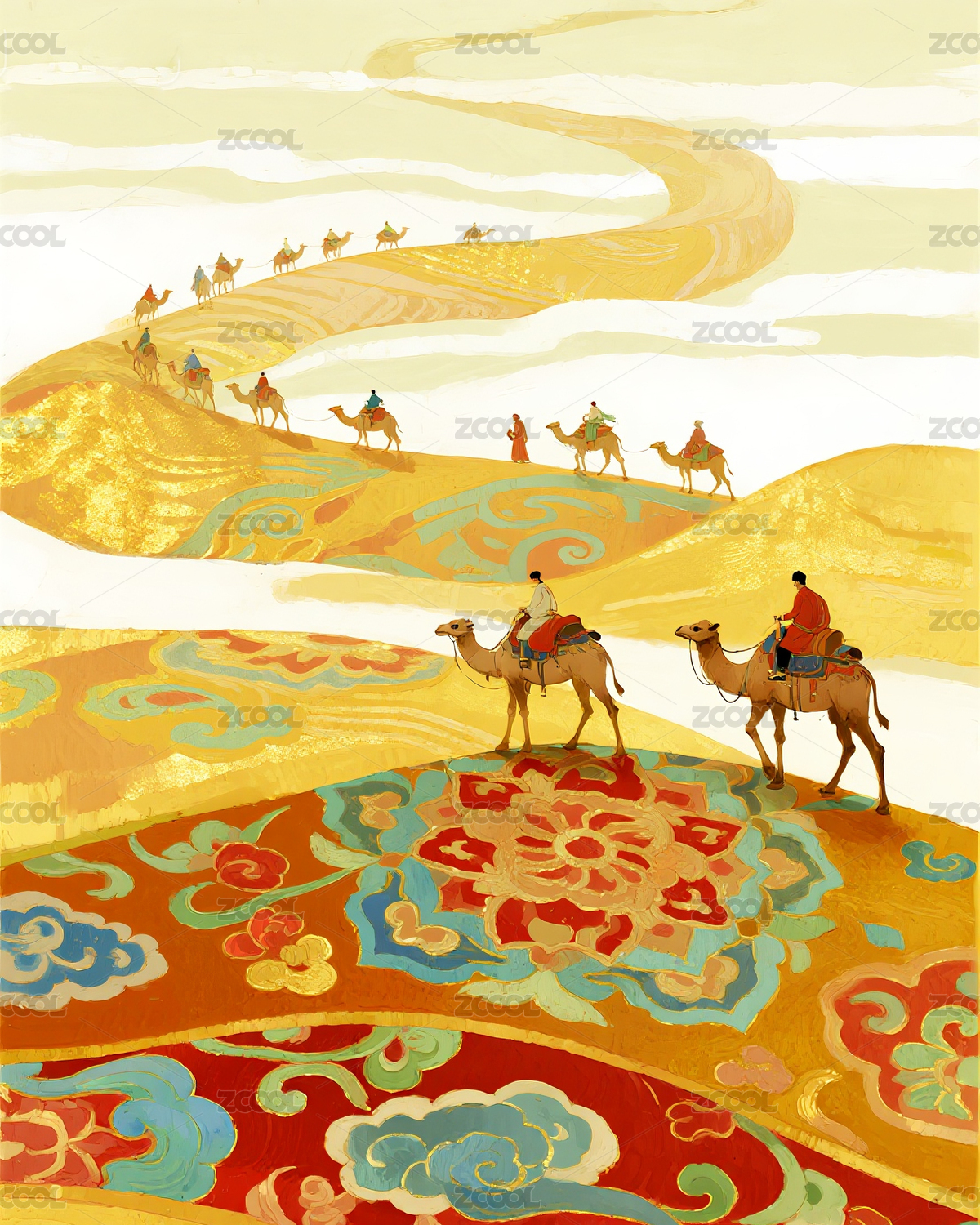 金色沙漠和行走的骆驼队,丝绸之路插画