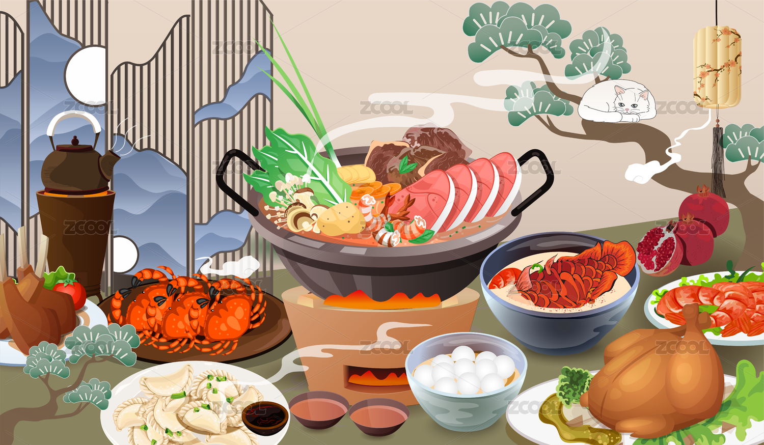 春节团圆年夜饭火锅国潮食物节日美食插画