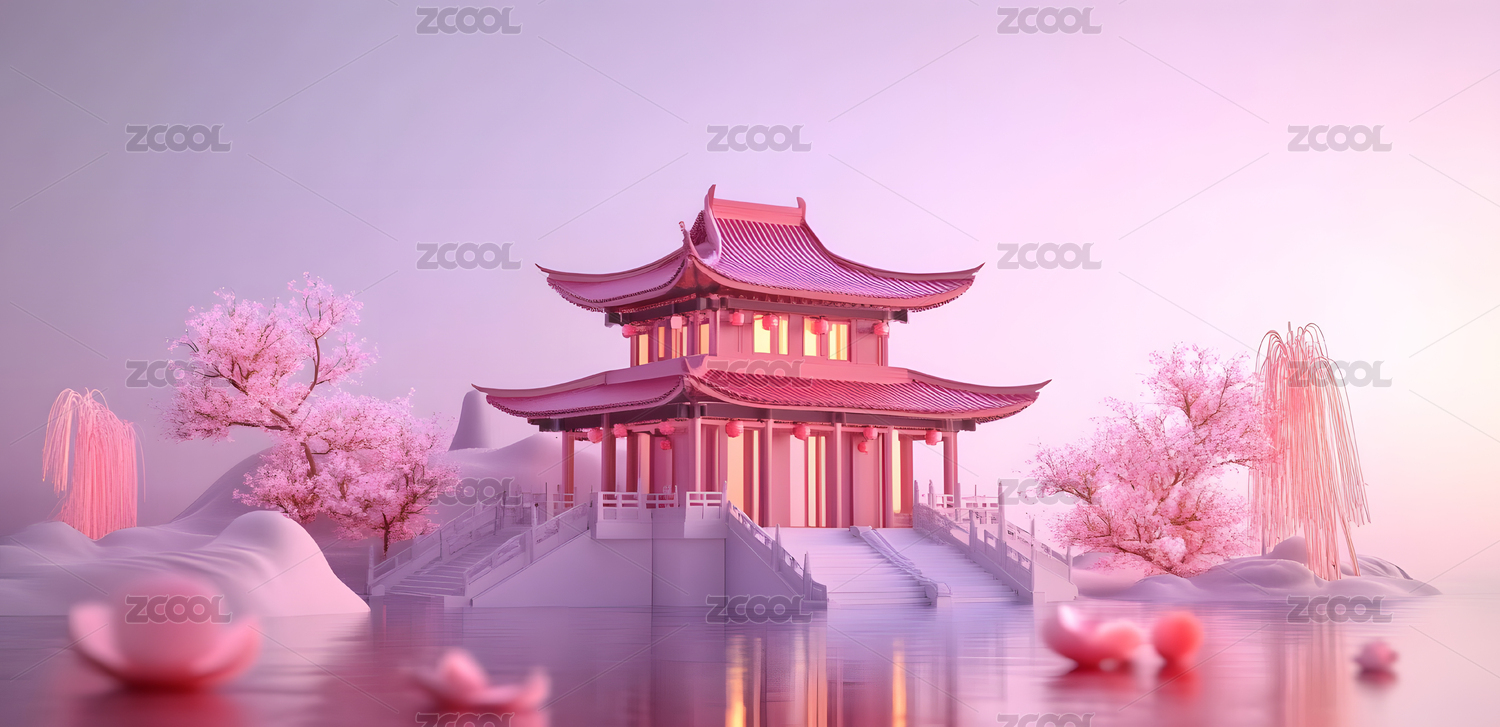 粉色系中式亭台楼阁山水景致