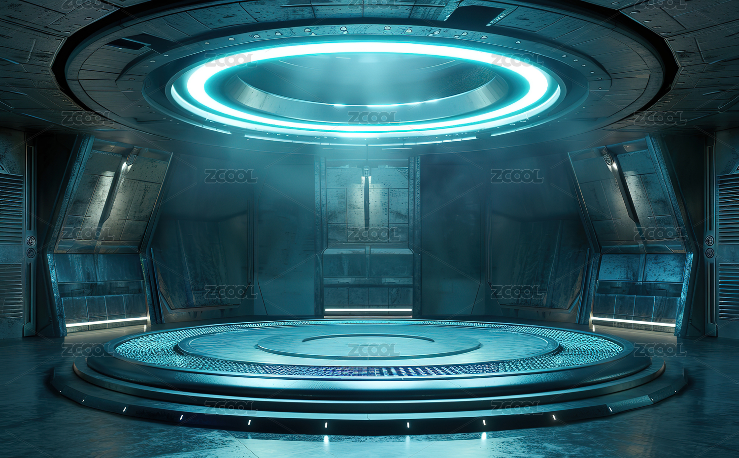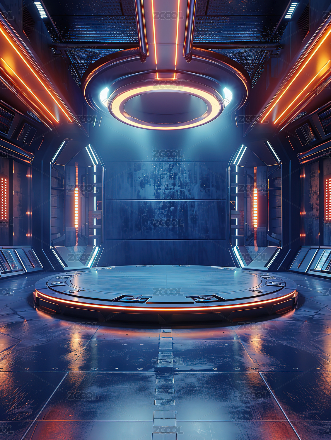 科幻风格环形舞台,蓝色和橙色灯光照射