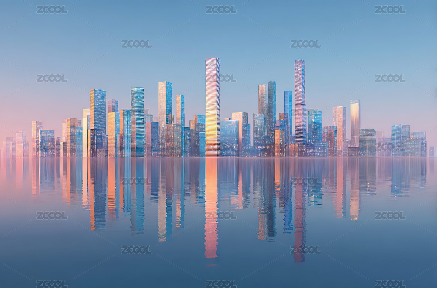 城市天际线倒影水面