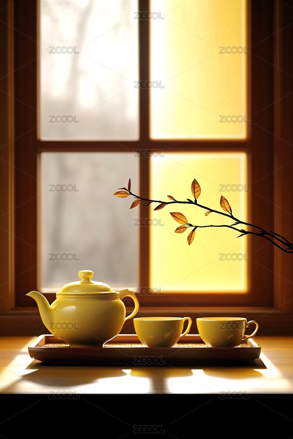窗边茶具与枝叶静谧场景
