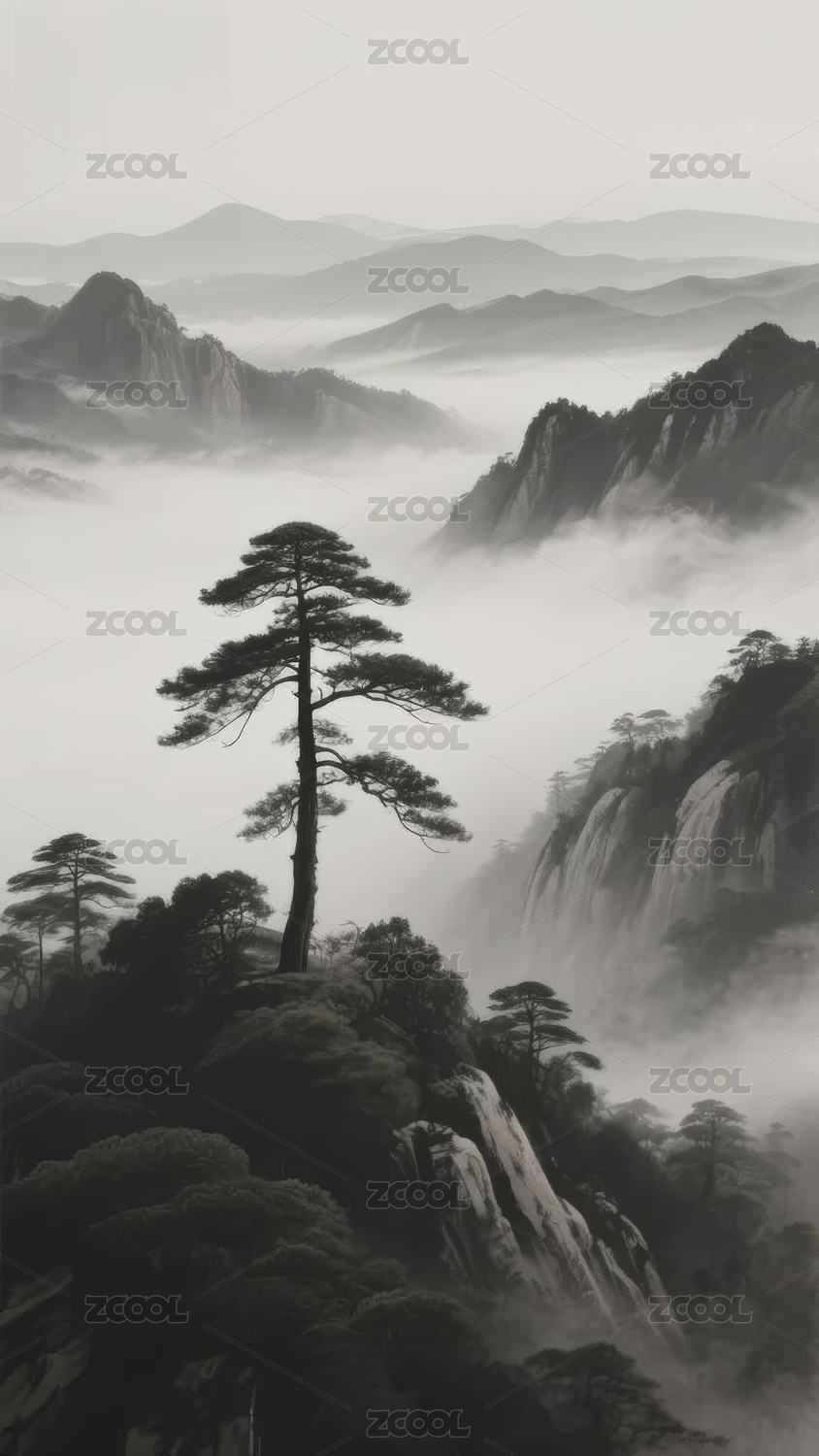 雾中山景孤松挺立
