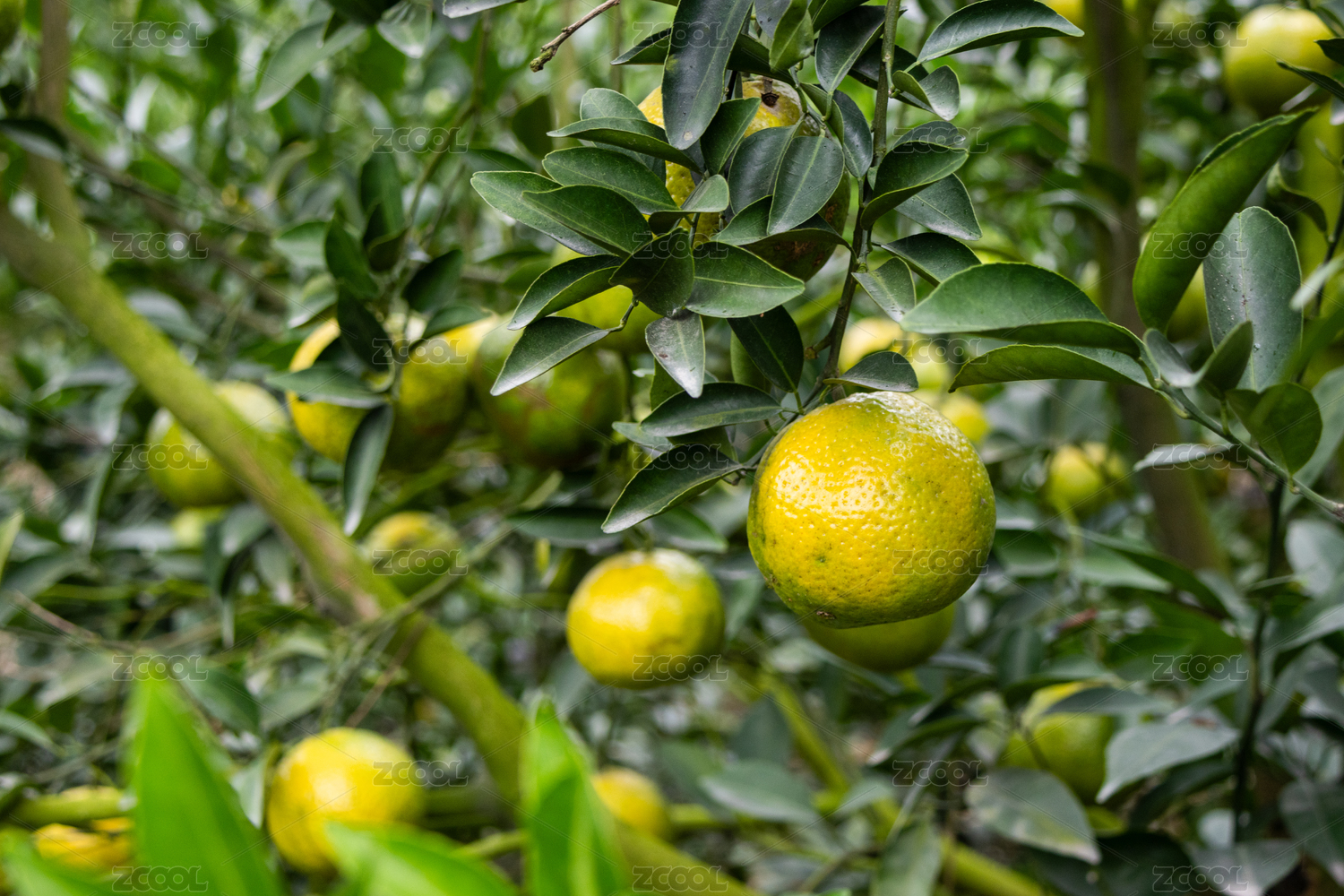 水果树枝头绿色桔子的特写