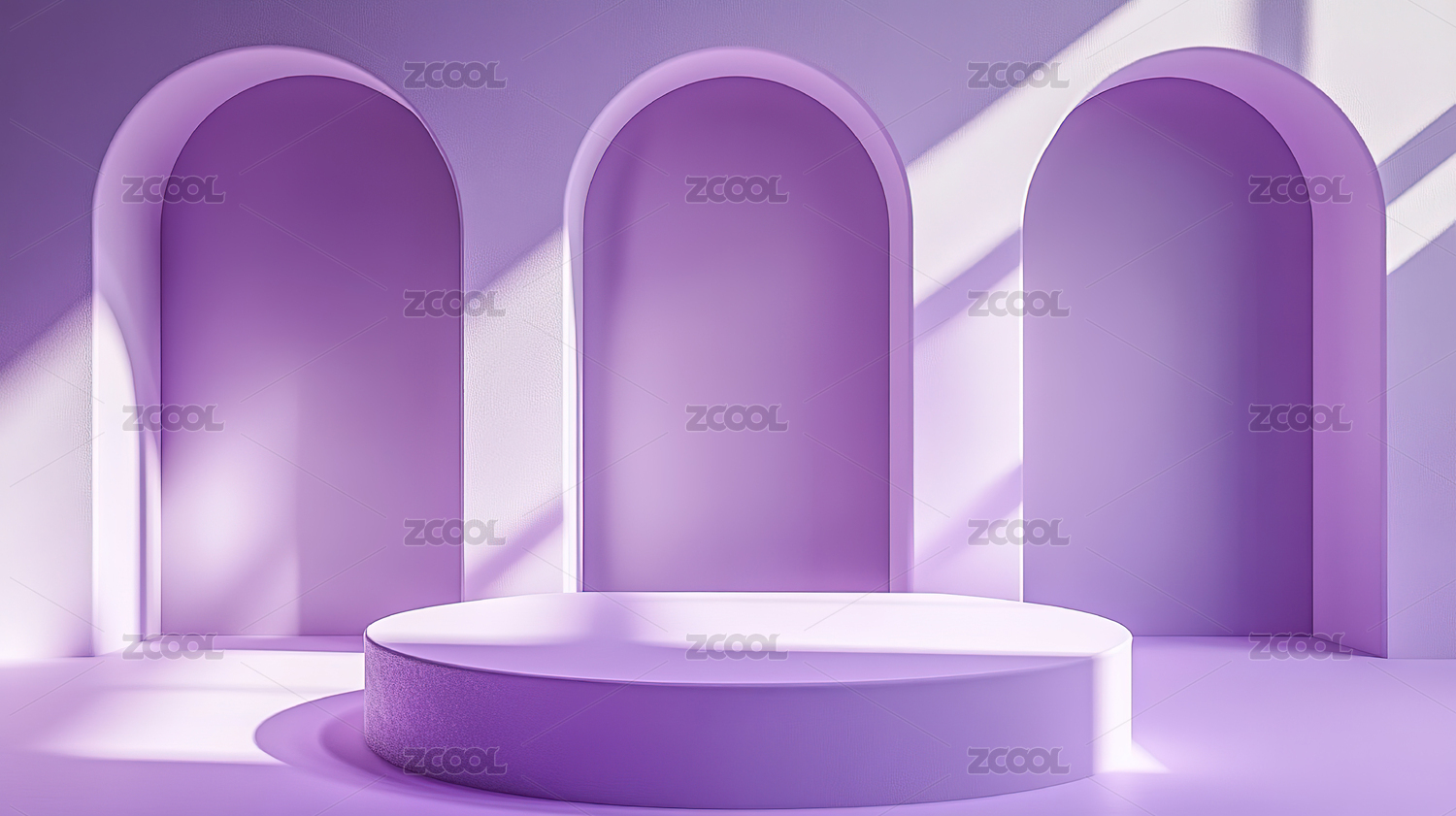 简约风格,白色,圆形底座,背景,深紫色,底座,紫色条纹,半圆形拱门,拱门,明亮